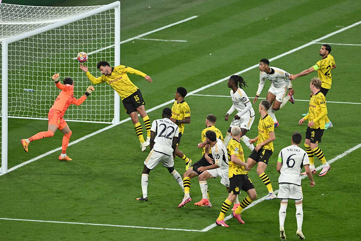 Media hora para el final y las espadas (y el sufrimiento) en todo lo alto; padecimiento que iniciábamos con un violento testarazo de Füllkrug que Courtois, despejaba a lo Mazinger Z: puños fuera. Por si no había quedado claro, el Dortmund demostraba otra vez que iba a vender cara su piel; el Madrid, no obstante, se mostraba más sólido. Mientras tanto, un ponzoñoso centro chut de Vinícius, al que no llegó Jude por flequillo, se fue llorando junto al palo borusser.