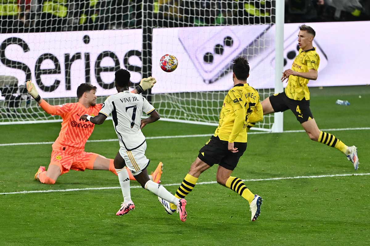 Los merengues, inoperantes, apenas Vini lo intentaba, sin suerte casi siempre, pero sembrando el terror las exiguas veces que pudo escaparse. Tanto ímpetu le puso, que vio una irrisoria tarjeta amarilla por presionar al portero del Borussia, Kobel, que saludó su presión con un doble tirabuzón con triple Axel que le valió absurda amonestación señalada por el paisano de Ceferin con silbato. Vini lo intentaba, Vini jaleaba, no obstante, al otro lado, sin noticias de Rodrygo y con Bellingham generalmente por los suelos, con todo el equipo, en definitiva, desnortado. El Borussia permanecía a lo suyo, agazapado, esperando volar para propinar su picotazo. Pudo ser el de Sabitzer, el del moñito, disparo duro y abajo. De nuevo, Courtois.