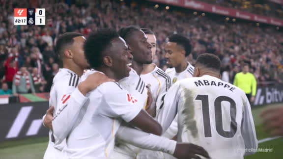 El comienzo no pudo ser más voraz por parte de los blancos. Ya a los tres minutos, Mbappé maniobró de manera soberbia sobre la línea de fondo y terminó obligando a Unai Simón a sacar el brazo de modo magistral, cosa que tuvo que hacer al minuto siguiente, de nuevo, tras un chut de Vinicius desde la frontal. Era la antesala del gol, dentro del mismo fulgurante inicio. Trent metió un balón largo marca de la casa, Mbappé controló, buscó el hueco en la frontal y disparó a la red con la clase incomparable que distingue a los más grandes del fútbol de siempre. Seis minutos, 0-1.