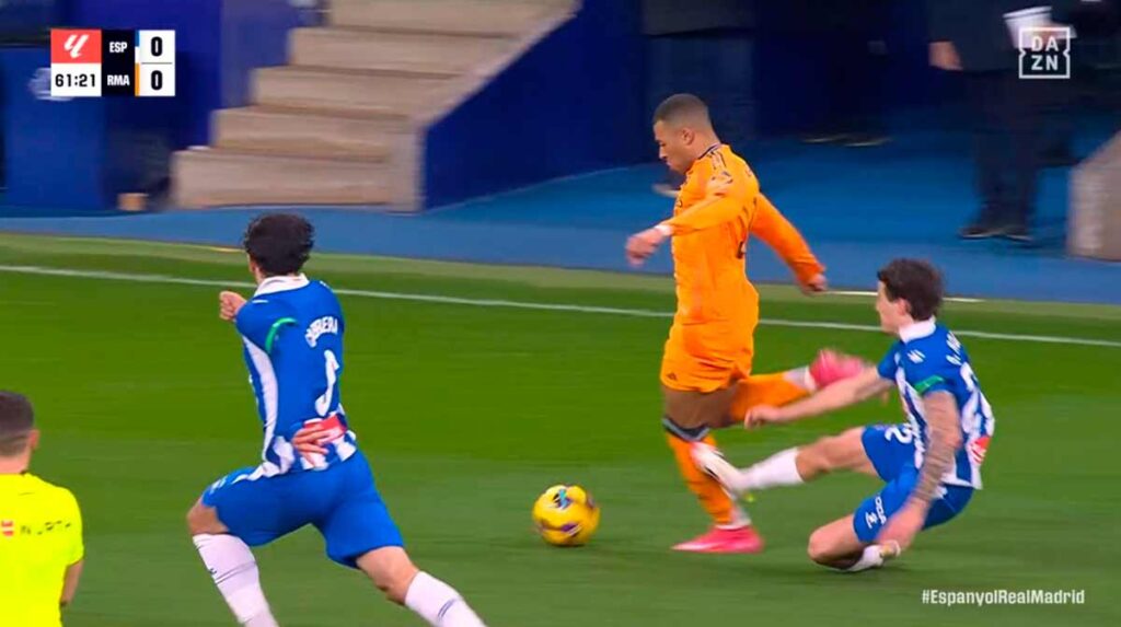 En el 60’, Romero hizo una entrada de roja clara a Mbappé en un peligroso contragolpe, pero el árbitro se quedó en la amarilla. Entre el gol anulado, una mano no señalada en el área del Espanyol y esto, el arbitraje estaba decidiendo el resultado del partido.