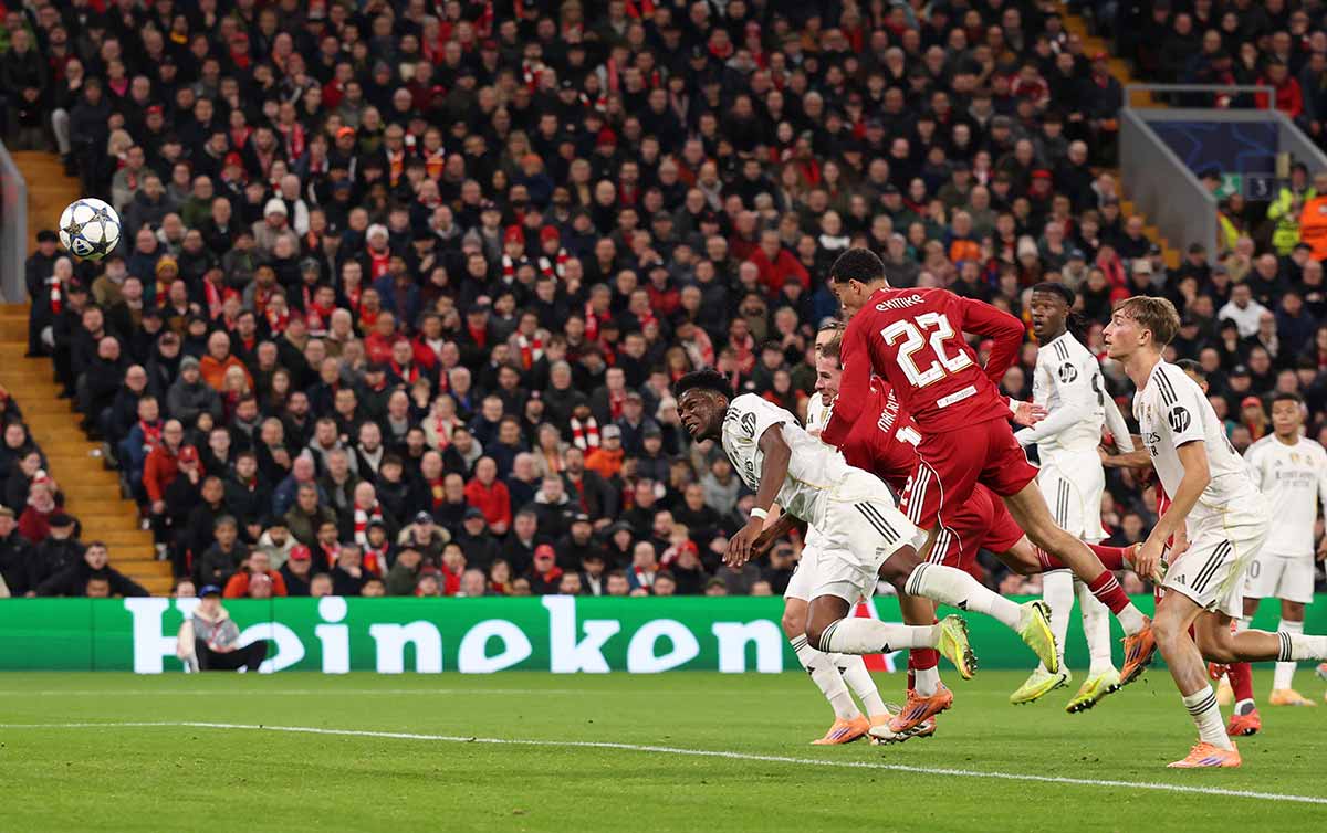 El Madrid consiguió enhebrar una jugada larga sin perder el balón, que hasta entonces era la tónica habitual —después también lo continuó siendo—, que concluyó con incursión y disparo de Tchouaméni. La respuesta del Liverpool, gol de Szoboszlai que no entró porque Courtois obró su enésimo milagro. Diez de cada ocho acciones como esas terminan en tanto. Los niños de Liverpool tienen pesadillas con Thibaut. El gigante verde tuvo que intervenir también para despejar de cabeza.