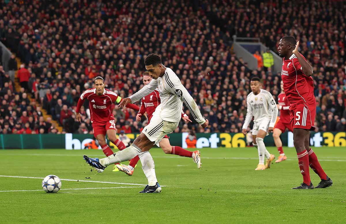 La primera del Madrid la tuvo Mbappé, que culminó una buena combinación de él mismo con Jude y Vini. Echó el cuerpo hacia atrás, como si estuviese en una tumbona, y el balón se le marchó a las nubes esas que habían dejado de llover hacía un rato. La acción pareció desentumecer al Madrid, que se sacudía en ese momento la hegemonía del Liverpool. Fue un espejismo. Así se llegó al 20, el minuto en el que se homenajea a Diogo Jota.