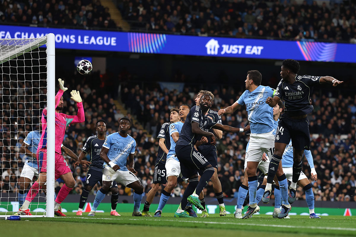 El encuentro comenzó en el Etihad, no confundir con Écija, donde hace más calor y se come mejor. Antes del primer minuto, Fede se quedó frente a frente —como cantaba Jeanette— tras ponérsela Vini de lujo, pero el uruguayo no acertó a sobrepasarlo por encima, que parecía el lugar más sencillo. A la siguiente jugada, ocasión clara de los azul clarito. Instantes después, manopla salvadora de Courtois a remate duro de Rodri.