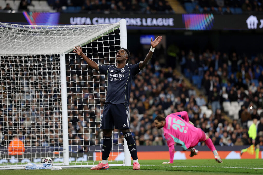 El City, a pesar de estar con uno menos y perdiendo, apretaba con mala baba. El Madrid debía ser inteligente y esperar. Vini tuvo otra clarísima, pero se le marchó a la derecha de la meta local. A poco que el brasileño hubiese estado más acertado, el resultado podría ser escandaloso a la media hora. Olés en el Etihad durante unos momentos.