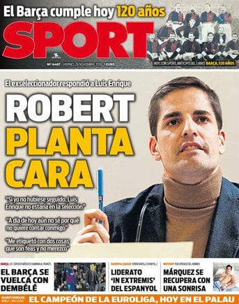 Buenos días. Hoy cumple 120 años el Fútbol Club Barcelona, y 'Mundo Deportivo' lo celebra con una portada antológica. Primero porque se vanagloria de que el equipo blaugrana lleva trece temporadas seguidas siendo primero en la fase de grupos de la Champions League -ganarla es lo de menos, eso se lo dejamos al Real Madrid- y segundo por la foto que envuelve dicha portada.