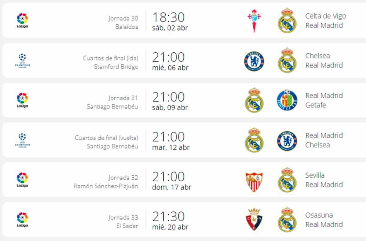 Cuatro días después del partido frente al Celta, el Madrid disputa el primer asalto de la pelea de Champions contra el Chelsea en Londres. Tan solo tres días después, el 9 de abril, los de Ancelotti vuelven al Bernabéu para medirse al Getafe, conjunto nada cómodo, y sin solución de continuidad, otros tres días y la vuelta de los cuartos de final de la Copa de Europa.