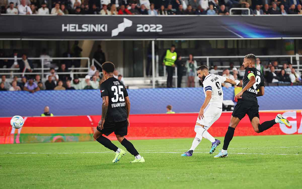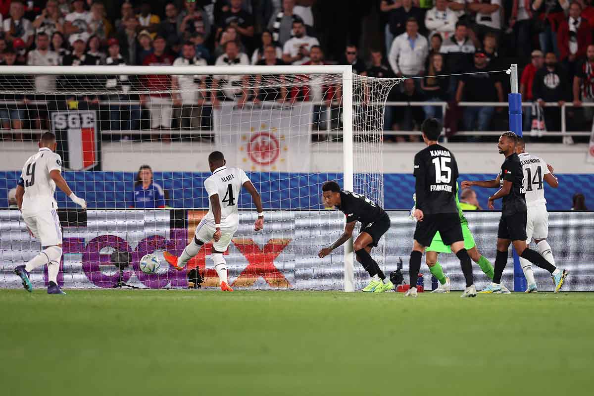 Enseguida, con todo, empezaron a carburar Vinicius y Benzema, que no se entienden con la mirada sino con una suerte de sentido telepático propio de Kung Fu y el pequeño saltamontes. Mientras, Militao se multiplicaba para imponer su ley del samurai y Kroos se ensamblaba con Casemiro para que la eficiencia de ambos se impusiera con un rigor seco. Como resultado, casi marca Vini en un remate que rebañó bajo palos Jota, y poco después hubo de ser Trapp quien sacara a córner un remate endiablado del propio Vini (man of the match probablemente) con la punta del guante. Lo que sucedió a continuación fue la lógica hecha saque de esquina: lanza Kroos, toca Karim, vuelve a tocar Casemiro en el segundo palo y Alaba la empuja. La sonrisa del brasileño saliéndose del campo y mirando hacia atrás, para constatar el tanto, encierra libros y libros de madridismo.