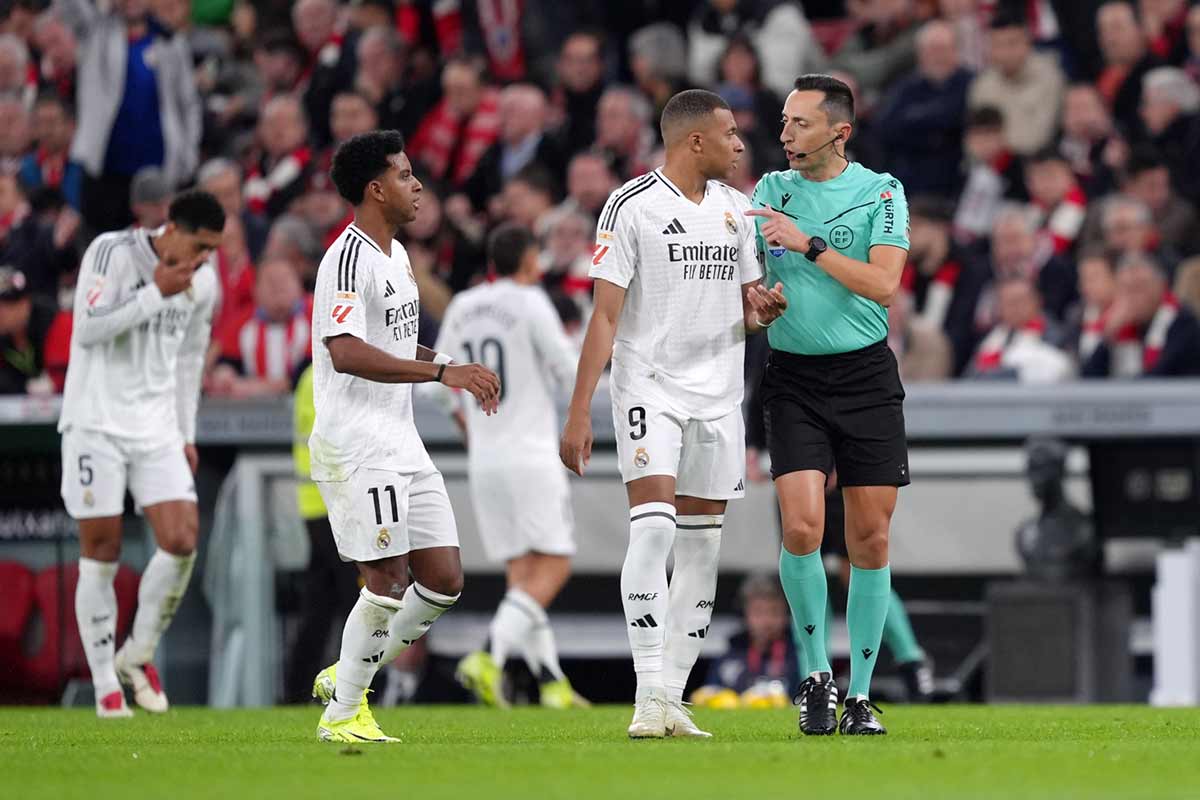 Con el paso de los minutos el Madrid se asentó algo con el balón. No era una maravilla, pero cuando llegaba el cuero a Rodrygo el panorama se aclaraba algo. Casi de manera consecutiva se sucedieron dos jugadas en las que el Madrid resultó perjudicado: primero un agarrón claro a Mbappé que ni árbitro ni VAR decidieron señalar como penalti. Después, Mbappé marcó un gol en fuera de juego, pero en la jugada previa hubo una zancadilla a Rodrygo en el área. El VAR avisó a Sánchez Martínez, que decidió que no era penalti.
