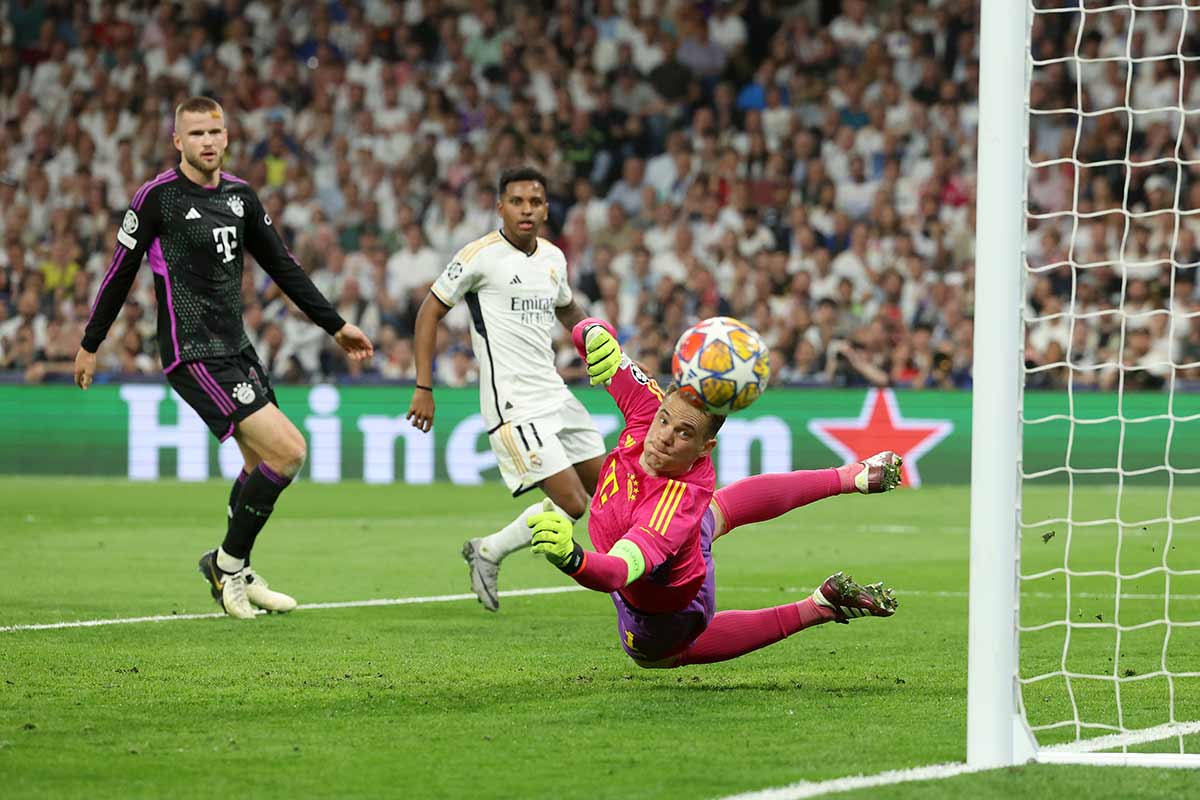 Creía merecer más el Madrid y con ese enervado brío regresó el equipo al terreno de juego. Pronto Valverde y Goes en sendas jugadas consecutivas estuvieron a punto de rematar a gol dos asistencias consecutivas de un sempiterno Vinícius, omnipresente, casi imparable. Como solución final para casi todo, Vini liquidaba defensores a medida que inflamaba a la grada. Neuer, cual fornido fontanero del cine porno, achicaba como podía; siempre con mano firme ante cualquier diabólico disparo lejano. Y cuando el arquero teutón no era suficiente, el larguero era quien repelía el enésimo tiro merengue, esta vez tras mortal caracoleo de Vini.