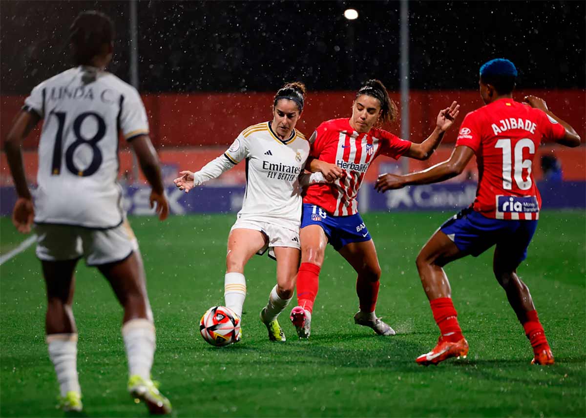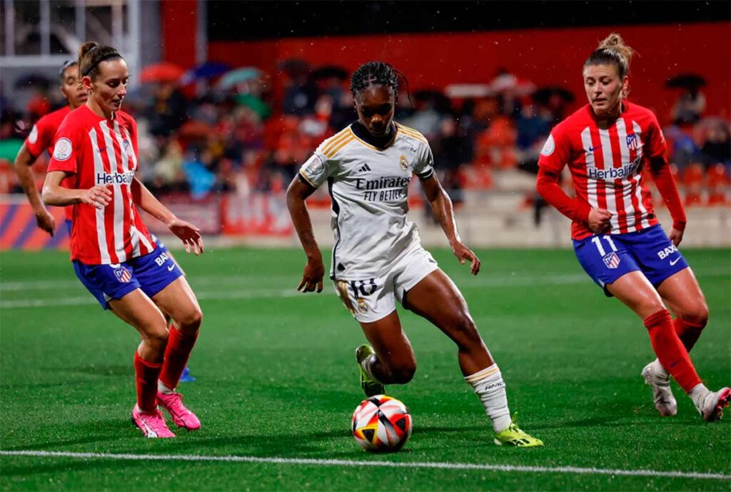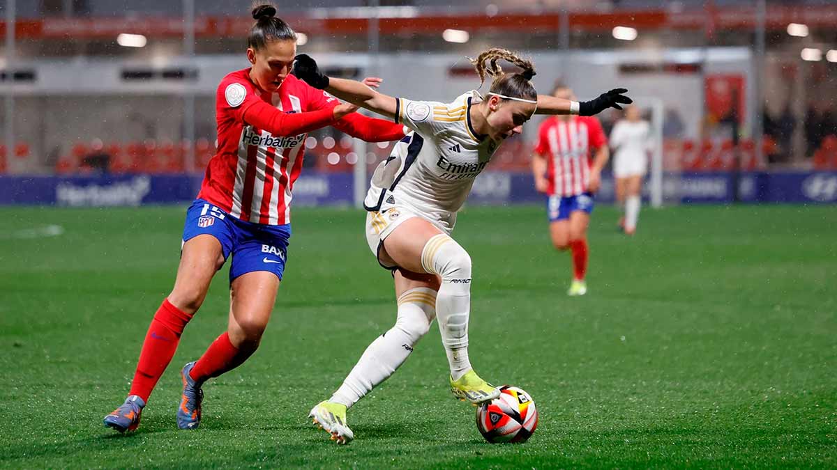 En la Ciudad Deportiva del Atlético de Madrid, el derbi madrileño de Copa de la Reina —antesala del calco que se vivirá dentro de una semana en Liga F— pintaba a cualquier cosa menos a oda al fútbol desde el instante en el que se confirmó el parte meteorológico de lluvia y viento. Ni los perfiles ofensivos dispuestos por el técnico local, Manolo Cano, ni el tridente blanco conformado por Athenea del Castillo, Linda Caicedo y Naomie Feller iban a ser suficientes para sacar del pozo de mal juego a sus respectivos conjuntos. De un lado, el Atleti sigue sumido en su particular mundo gris y aburrido desde que la irrupción del Madrid le arrebató la posibilidad de disputar competición europea; del otro, la temporada de las madridistas parece abandonada y olvidada hasta verano, como la consola que únicamente podrá sacarse del cajón a final de curso.