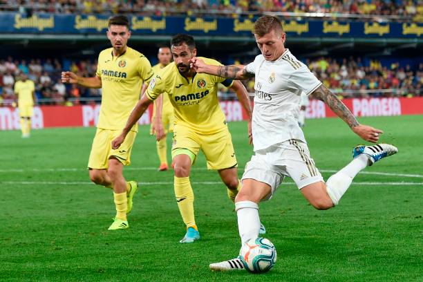 Dispuso Zidane un 1-4-4-2 que no funcionó en la segunda parte ante el Valladolid. El Madrid comenzó muy largo y sin apenas poder controlar el juego. Kroos y Casemiro se veían obligados a recorridos muy extensos que apenas les permitían reposar. El brasileño en la batalla se sentía más cómodo, aunque a veces las jugadas le cogían lejos de su defensa. El Villarreal comenzó tratando de controlar el balón dada su superioridad en el centro del campo. Un error de Ramos les permitió adelantarse y disfrutar de un guión ideal para sus intereses.
