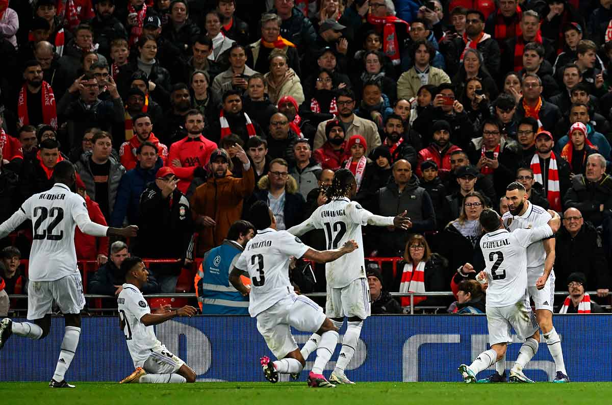 El Liverpool acusaba el golpe, directo al mentón. El púgil red se tambaleaba sobre el ring y el campeón blanco olió la sangre. De nuevo a los cinco minutos, una rápida combinación, tuya-mía entre Karim y Rodrygo, concluyó con un afortunado remate de Benzema que tropezó en Joe Gómez y se alojó en la portería del Liverpool. 2-4 a los 55 minutos para jolgorio de un madridismo feliz, sobre todo en Anfield.