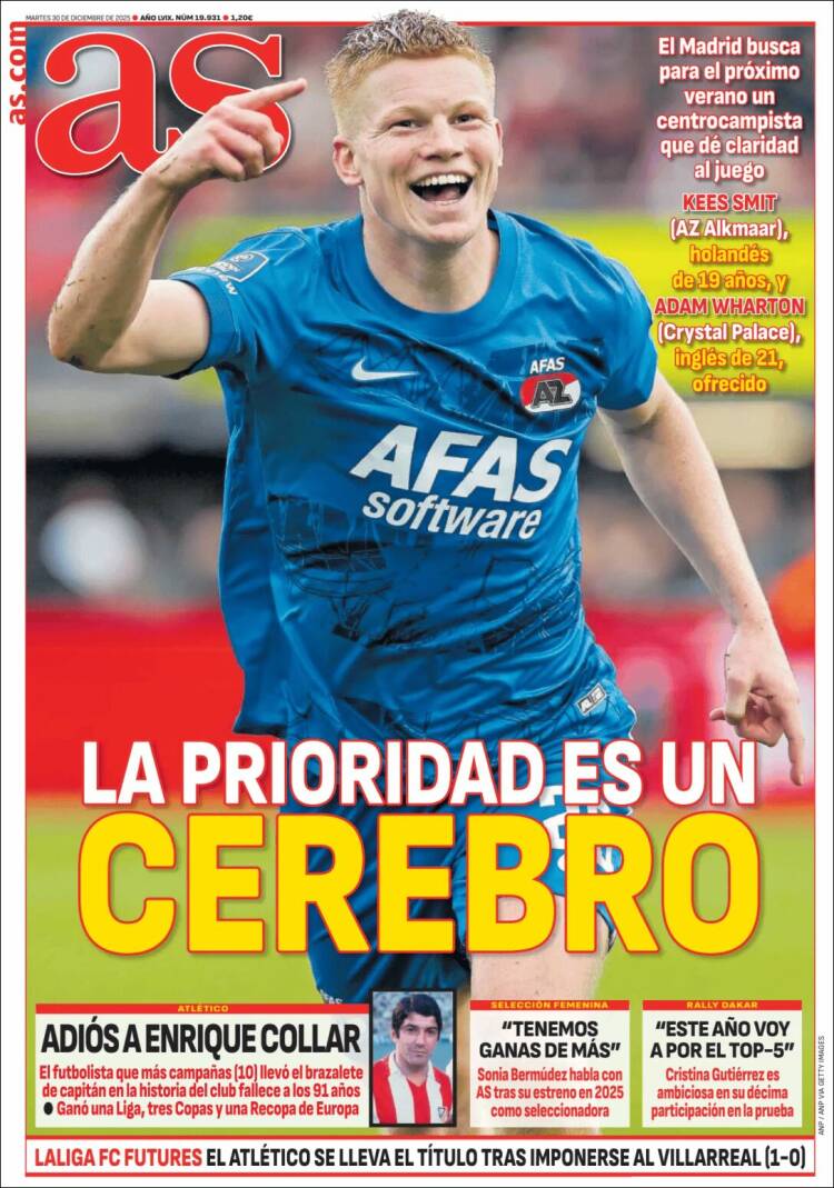 «La prioridad es un cerebro», titula el diario de PRISA. Según este periódico, el Madrid busca para el próximo verano un centrocampista que dé claridad al juego, y saca a la palestra los nombres de los jóvenes Kees Smit y Adam Wharton.