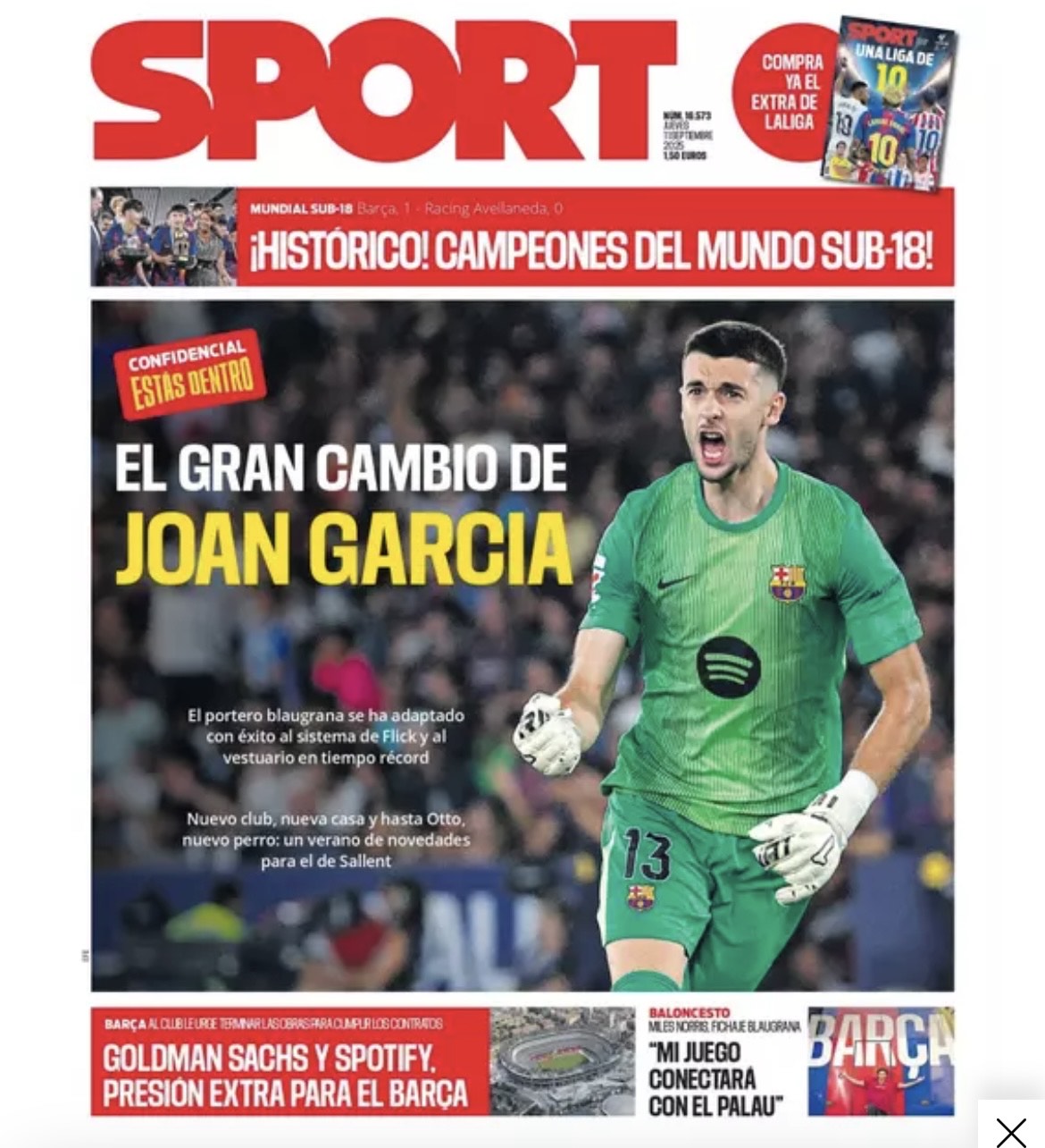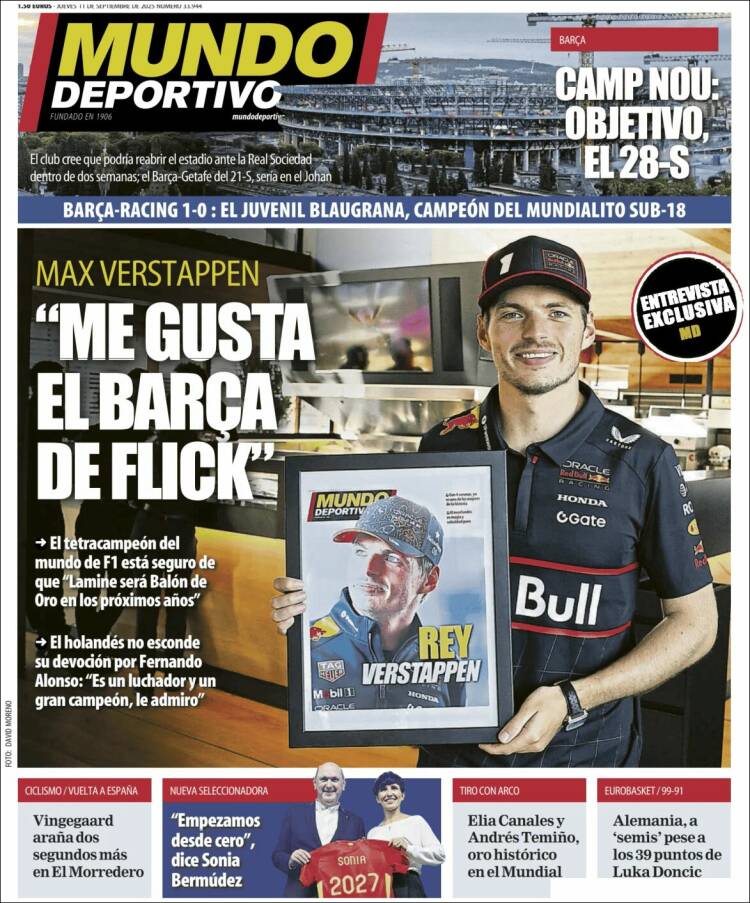 Saltamos a las portadas cataculés comenzando por el diario del Conde de Godó, Grande de España. El periódico en cuestión nos muestra a Max Verstappen, fantástico piloto de Fórmula 1 y tetracampeón del mundo de la disciplina. El titular es que dice que le gusta el Barça de Flick. El hecho de que acote tanto su preferencia por este equipo específico podría muy bien implicar que no le gustan tanto las anteriores iteraciones de la escuadra culé, incluyendo aquellas correspondientes a las, que se sepa, 17 temporadas en las que el club pagó casi 8 millones de euros al vicepresidente del Comité Técnico de Árbitros. Todo podría ser. Hay espacio en la parte superior para actualizar al curioso lector sobre el punto de situación de las obras del estadio barcelonista. 28-S dicen, así, sin especificar el año. Todos sabemos que por hache o por be hay que acabar saneando y que vaya chapuza que les han hecho con el sintasol. Además, parece que la bajante de fecales y los botes sinfónicos están para tirar, y eso no es cosa de cinco minutos.