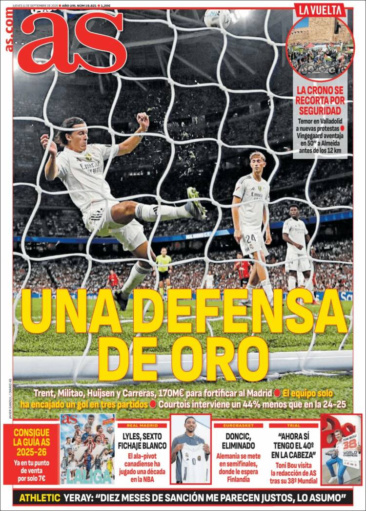 El diario prisaico por excelencia, As, habla de una defensa de oro. La imagen es la de nuestro nuevo ferrolano favorito, Álvaro Carreras, realizando el colosal despeje con el que evitó el gol del Mallorca en el último partido. Es eso o que Álvaro une a sus virtudes deportivas la habilidad de la danza, pues muy bien podría estar ejecutando un kazachok cosaco, baile tradicional ucraniano y ruso que incluye complejísimas acrobacias. El caso es que la imagen incluye a un Huijsen atónito contemplando el despliegue de facultades de Carreras. Triple mérito por haber sido capaz de hacer que Dean abra tanto los ojos.