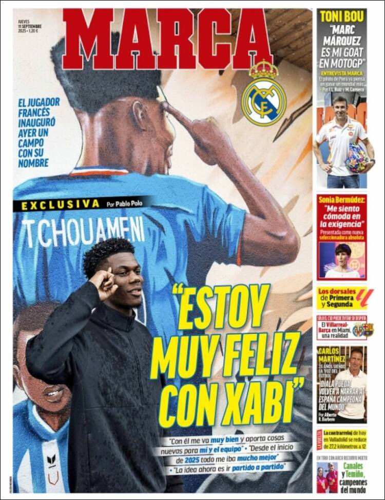 El diario Marca, mascarón de la presunta central lechera de acuerdo con la manera en que la motejó el Gandhi de Santpedor, pese a estar dirigido por un presunto aficionado del campeón moral de las champions de 2014 y 2016, nos muestra a Aurélien de nuestras entretelas. Manifiesta el jugador, en su gesto habitual de celebración, que está encantado con Xabi Alonso. Nosotros también con ambos. Poca gente podrá entender la posición del jugador en particular, y el madridismo en general, como el nuevo entrenador de nuestro equipo. Tchouaméni lo pasó mal, sí, porque no terminaba de encontrar su sitio ni su juego. Tampoco ayudaron las actitudes de los de siempre, es decir, la prensa presuntamente madridista y sus opinadores, así como el sector más lanar de la afición de nuestro club. Estos últimos individuos siguen convencidos que sus pitadas al jugador tuvieron un efecto taumatúrgico, como una especie de desfibrilador para su rendimiento. Lo que no parecen tener en cuenta es que muy pocos de esos creadores de opinión son aficionados de nuestro club, sino que se solazan con sus derrotas y problemas.
