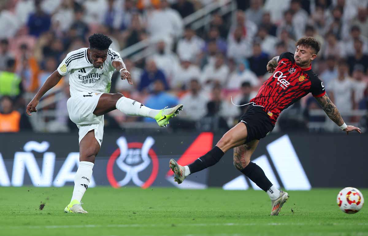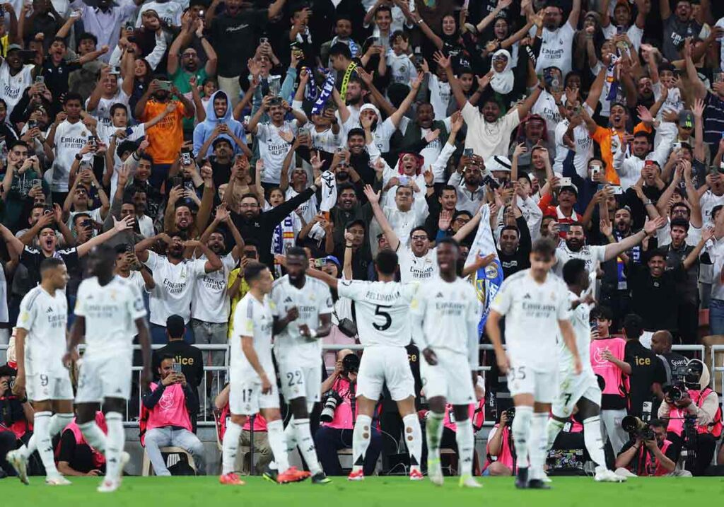 A falta de media hora para el final del encuentro, el atasco merengue ya era una realidad. Entre ardor, tarascadas y codazos —con nuevas estrellas mallorquinas invitadas como Dani Rodríguez— el Mallorca, no sin esfuerzo, había colocado el partido donde quería. Y como casi siempre sucede cuando enfrente está el Real Madrid, la esperanza apenas duró un par de minutos. Muchísimo menos tardó Mbappé en arrancar y cruzar media cancha como un tren de mercancías. Kylian sirvió profundo a Vinícius, hoy sin trenzas, que consiguió sacar un centro fabuloso, con el central subido a la chepa, que Goes remató en plancha de cabeza al palo. Mbappé recogió el rechace y fusiló al arco, pero se encontró con la fenomenal intervención de Greif. El balón regresó a los pies de un jugador blanco, en una especie de concurso de merengues, con el agravante de que esta vez fue a parar a las botas de Jude, goleador de nuevo, descerrajando el cerrojo de la final de la Supercopa saudita, ante la atenta, por cierto, de un ovacionado Benzema en un palco privado.