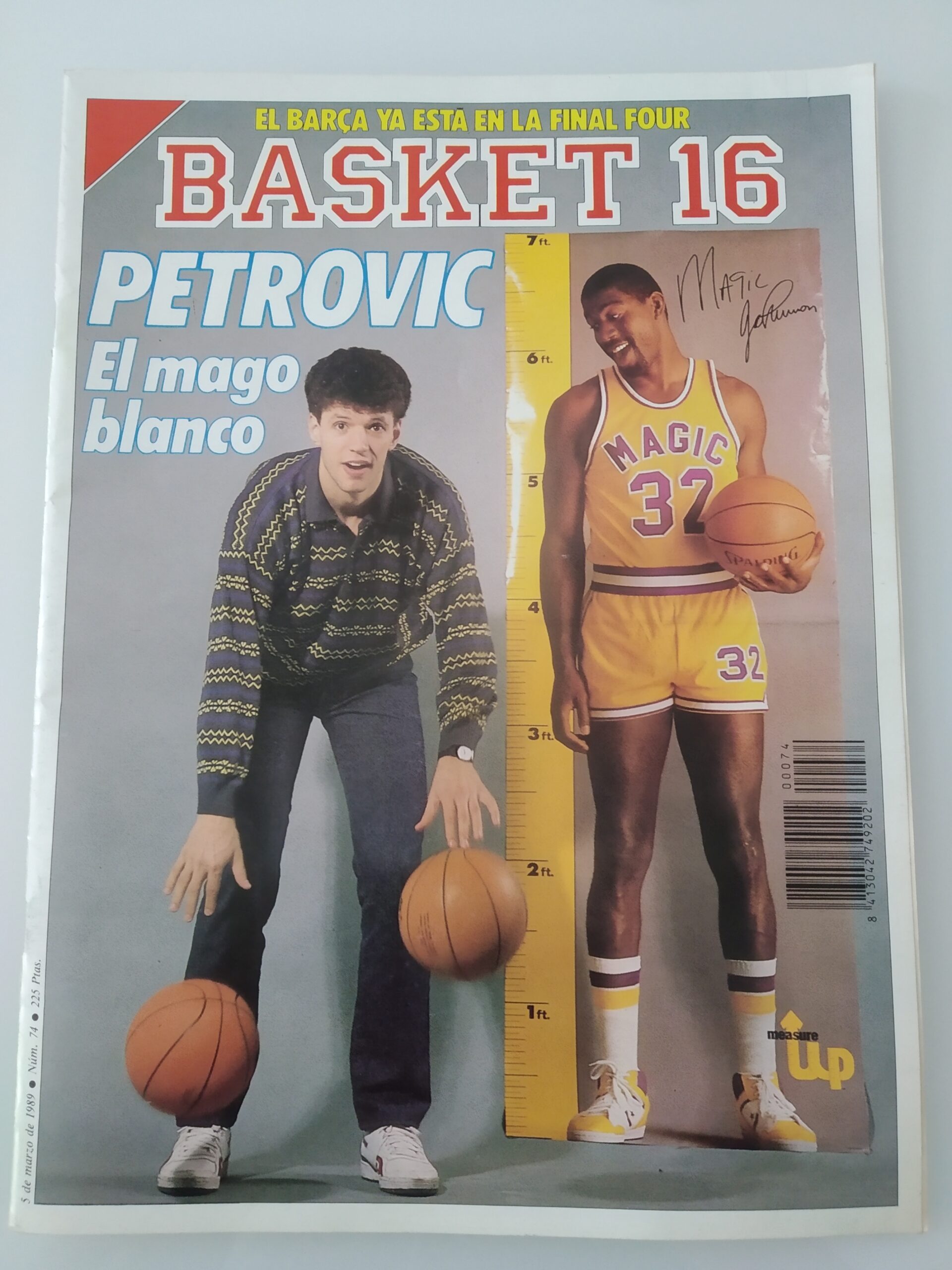 El 5 de marzo de 1989, en la revista 'Basket 16' (una idea de Pedro J. Ramírez para el Grupo 16, que se extinguiría en ese mismo verano de 1989), Dražen Petrovic había concedido también a quien aquí suscribe una entrevista/reportaje especial que se titulaba en portada, número 74 de 'Basket 16': 'Petrovic, el mago blanco', con Dražen haciendo filigranas bajo la mirada de Earvin 'Magic' Johnson, genio y líder supremo de aquellos Lakers del 'Showtime', enmarcado en un 'poster' tamaño natural; aquí ofrecemos la imagen de esa portada. A sólo diez días de la final de Recopa Real Madrid-Snaidero, del 14.3.89, en El Pireo, Atenas, el texto se titulaba en sí mismo: 'Dražen Petrovic, 12 días que estremecieron al mundo de la canasta'.