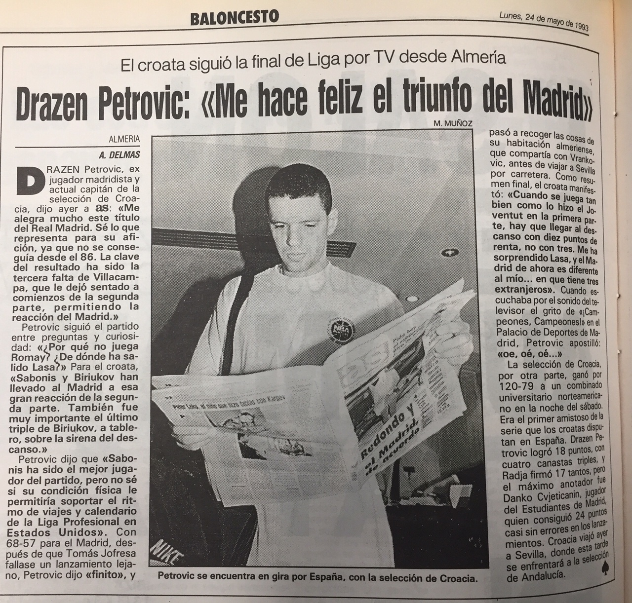 Al diario 'AS', antes de que lo adquiriera PRISA, le interesó sobremanera lo que Dražen Petrovic pudiera decir a quien aquí suscribe, a lo largo de aquel 'fin de semana andaluz'. Y el domingo 23 de mayo de 1993, el mismísimo Arvydas Romas Sabonis, uno de los rivales 'históricos' del propio Petrovic, capitaneaba a un Real Madrid que entrenaba Clifford Luyk hacia el mismo título de Liga ACB que el Real 'de Petrovic' no había podido cerrar en 1989, con un definitivo 78-69 en el quinto partido de la Final que sentenciaba el victorioso 3-2 del Real Madrid de Luyk y Sabonis ante el Joventut de Lolo Sainz. Esa misma tarde, el Sevilla de Maradona caía por 5-0 en el Estadio 'Santiago Bernabéu'' ante el Real Madrid de Benito Floro, el que iba a ser expoliado en Tenerife por Celino Gracia Redondo, como Floro nos recordaba hace muy pocos días en estas mismas páginas.