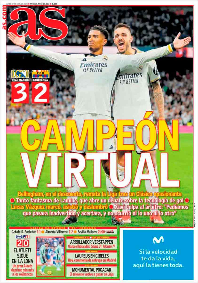 "Campeón virtual", titula As, con la foto icónica de Jude Bellingham abriendo los brazos de cara al público (y Joselu secundándole apretando los dientes). El inglés es el icono mundial del madridismo, su máximo estandarte, y también el jugador bandera de esta liga de chichinabo a despecho de que el negreirato 2.0 le birle goles sobre la bocina y encima le sancione dos partidos por decir "It's a fucking goal" en respuesta al atropello. Así trata la liga (con minúscula) de Tebas a sus estrellas. Cuidado, por otra parte, porque lo de "fucking" lo volvió a soltar ayer, y esta vez por escrito, encima, y en redes sociales. Cuidado, Jude, que te estás jugando una nueva sanción. Los estamentos no se andan con chiquitas con el uso de la "f-word". Además, ¿quién te has creído? Ni que fueras la máxima sensación del fútbol mundial y esta liga de tres al cuarto tuviera ninguna razón para cuidarte.