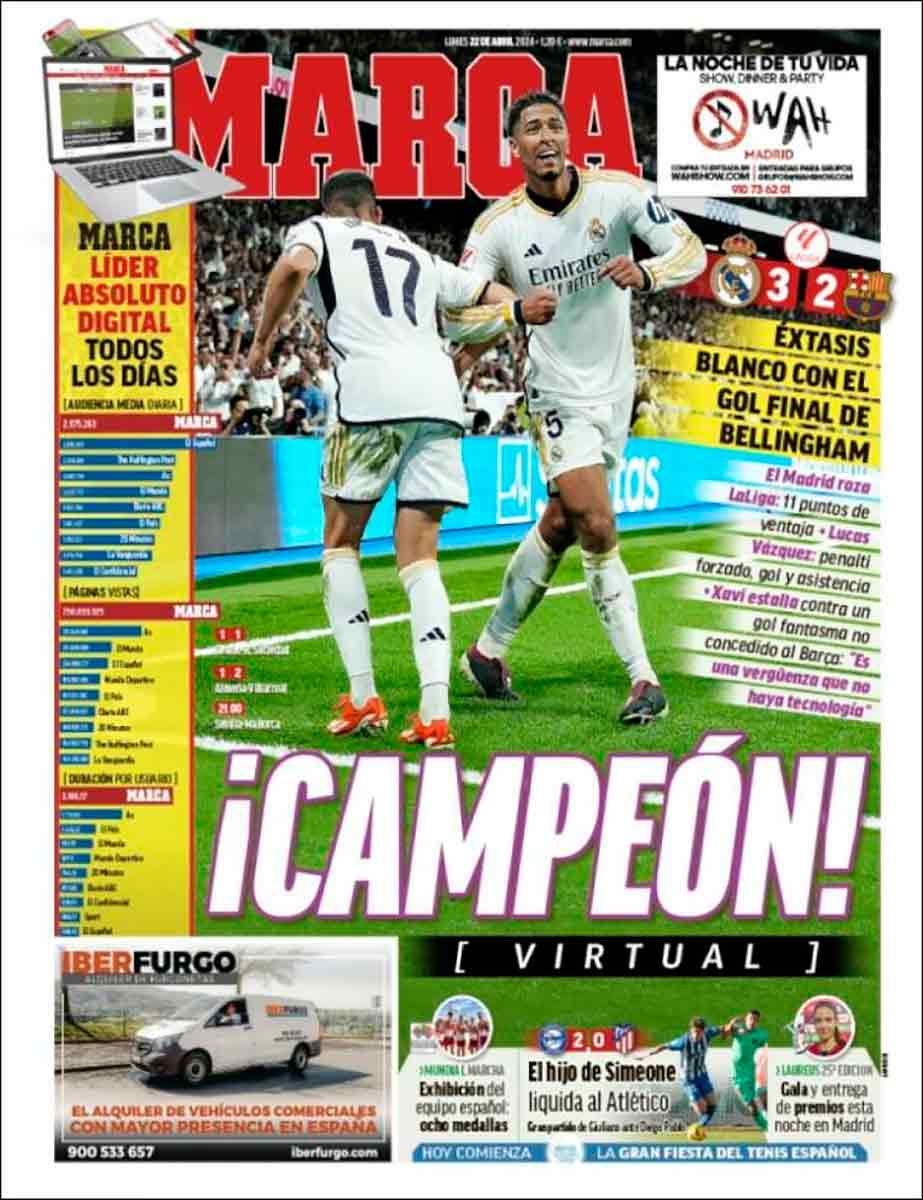 Buenos días, amigos madridistas, y enhorabuena por lo que, desde ayer a eso de las once de la noche, es ya virtualmente un nuevo título de liga. La cosa quedó básicamente vista para sentencia tras una victoria ante el FC Barcelona que tuvo todas las trazas de la épica característica del Real Madrid, un Real Madrid que remontó las dos ventajas culés en el marcador a punta de casta, con el mejor partido en la carrera de Lucas Vázquez y un gol decisivo del mejor futbolista del campeonato: Jude Bellingham. Y todo ello bajo la luz rutilante y completa del nuevo videomarcador en 360 grados que anoche estrenó ante el mundo el nuevo estadio Santiago Bernabéu.