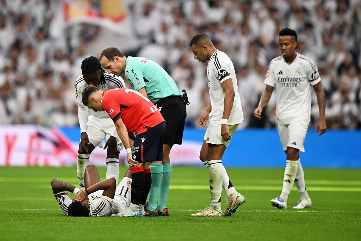 El campeón de Liga —no lo olviden— presentó así un equipo mucho más compacto, serio en defensa, pero monocorde en ataque, frío cual ciudadano luxemburgués en un festival de cante jondo en Coria del Río; dinámica que acaba siempre por confluir en música de viento del Bernabéu. Sólo Rodrygo, desde lejos, pudo probar al portero navarro, minutos antes de lesionarse, sentarse en el banquillo entre lágrimas, e iniciar el maleficio que permanece cernido sobre nosotros.