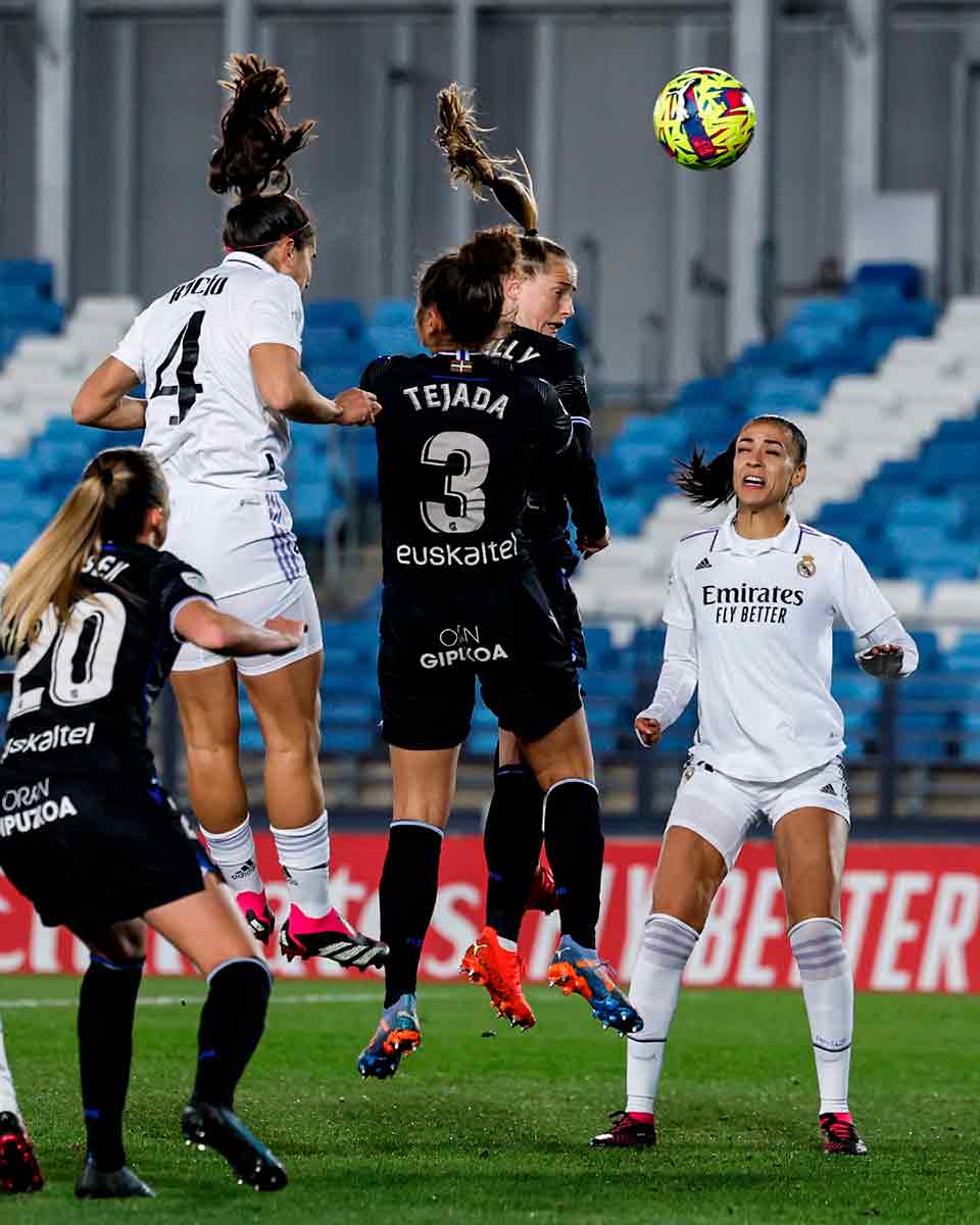 En un encontronazo fortuito en el centro del campo, la realista Bernabé chocó con Feller y la pareja de baile de la francesa acabó lesionada en la lona. Poco después, al encuentro del primer balón parado buscando el área de las visitantes acudió como un reloj Rocío Gálvez, y con la presteza de un jerarca blanco cabeceó a gol antes de volver a su sitio. En esa sucesión de acciones quedó definido el partido. La Real podía mover el balón, pero el Real aguardaba paciente como un veterano de guerra. Sus golpes siempre serían más fuertes.
