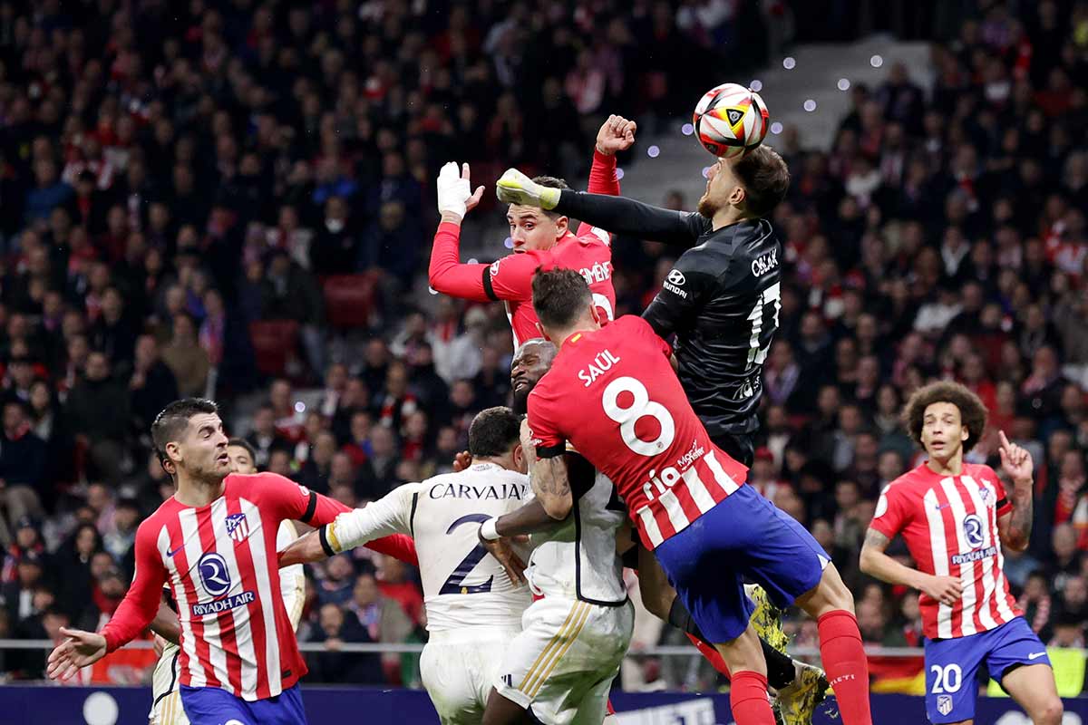 Durante los primeros minutos, el jugador madridista que más tocó el balón fue Lunin, incluso más adelante se permitió algún pase en largo de calidad. El Madrid no presionaba arriba y el Atleti estaba cómodo y más punzante. Un par de avances madridistas, uno de Jude y otro de Rodrygo, fueron frenados en falta por la defensa rojiblanca, pero el colegiado prefirió no señalarlas. Pero duró poco y en seguida la escuadra blanca tomó las riendas y comenzó a jugar como sabe.