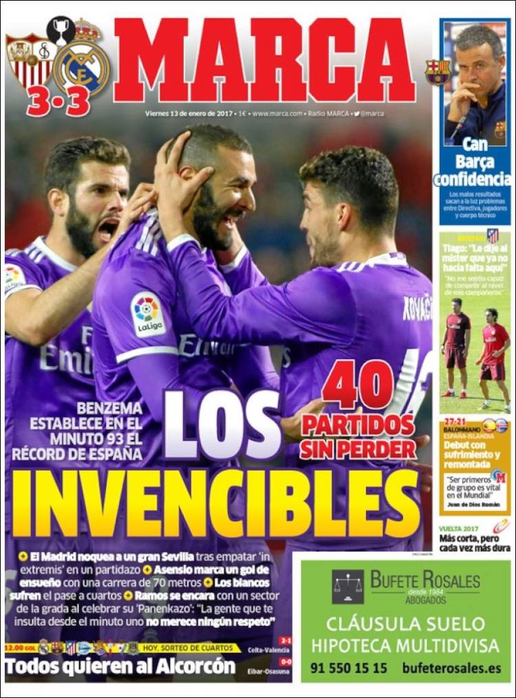 Es que lo de la prensa es increíble, anoche zapeando veo a un "periodista" quejarse amargamente de que "como podía Ramos marcar ese gol de penalti al Sevilla cuando este se estaba jugando el pase de la eliminatoria" . Inaudito no.