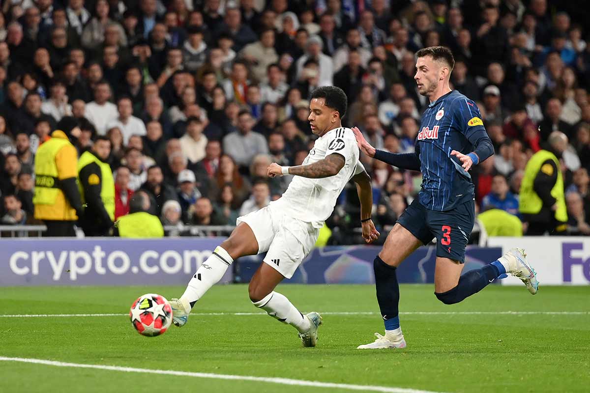 En contra de lo que podíamos prever, el Madrid no salió ejerciendo un fútbol dominante y era el Salzburgo quien tenía el control de la pelota. Al filo de los 10 minutos, un disparo de Gloukh no se marchó muy lejos del palo izquierdo de Courtois. Los blancos debían despabilarse y agarrar el timón del choque.