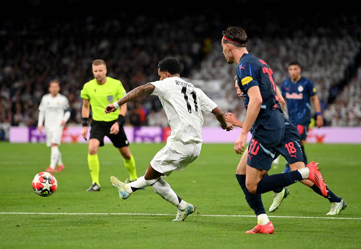 Prácticamente sin tiempo para terminar de escribir el párrafo anterior, una buena acción de Valverde terminó con el balón en Mbappé, quien le dio continuidad hacia un Vini que lo puso a la llegada de Jude, pero el inglés no pudo controlarlo y fue Rodrygo el que apareció por la derecha para cruzarlo adentro. Primer tiro, primer gol. 1-0.