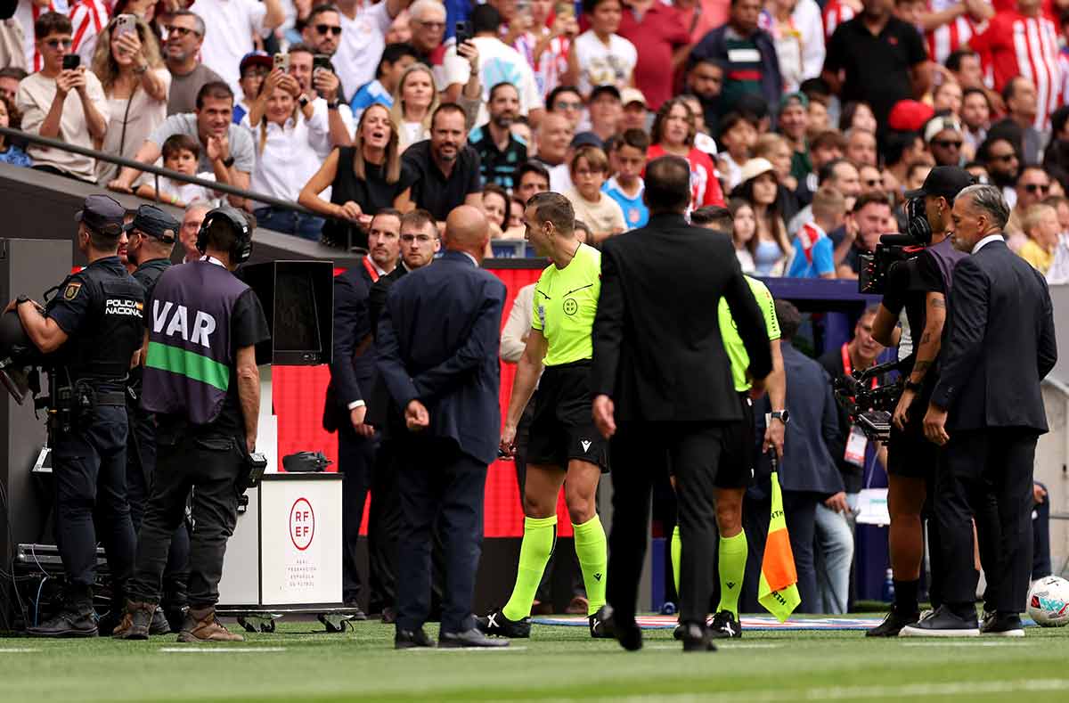 En el 13' se adelantó el Atleti. Centro bueno de Giuliano desde la derecha y testarazo de Le Normand que se adelantó a Tchouaméni. El balón despeinó a Courtois. El Madrid no estaba transmitiendo las sensaciones que transmite este Madrid de Xabi. Poco después, gran acción defensiva de Jude para evitar un posible segundo tanto colchonero. El Madrid necesitaba que lo cogieran por las solapas y le metieran un meneo para que espabilara. En lugar de eso, le cambiaron el pinganillo a uno de los auxiliares. Y, claro, no tuvo el mismo efecto.
