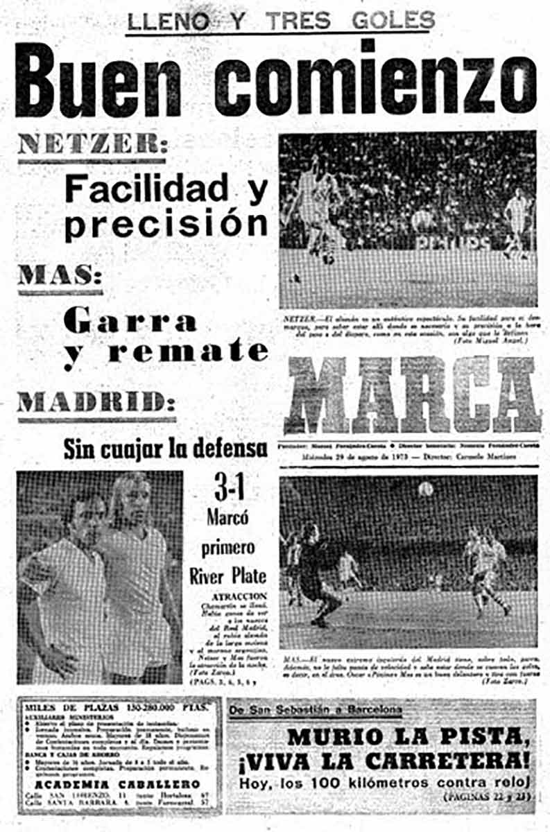 El Real Madrid batió a River por 3-1, tantos de Santillana, Pirri y Aguilar, más Edgardo Di Mola —que abrió el marcador— para los 'Millonarios'. Netzer ('Facilidad y precisión', titulaba 'Marca' el miércoles 29.8.73) jugó los 90 minutos; Más ('Garra y remate') fue sustituido en el segundo tiempo por Rafa Marañón.