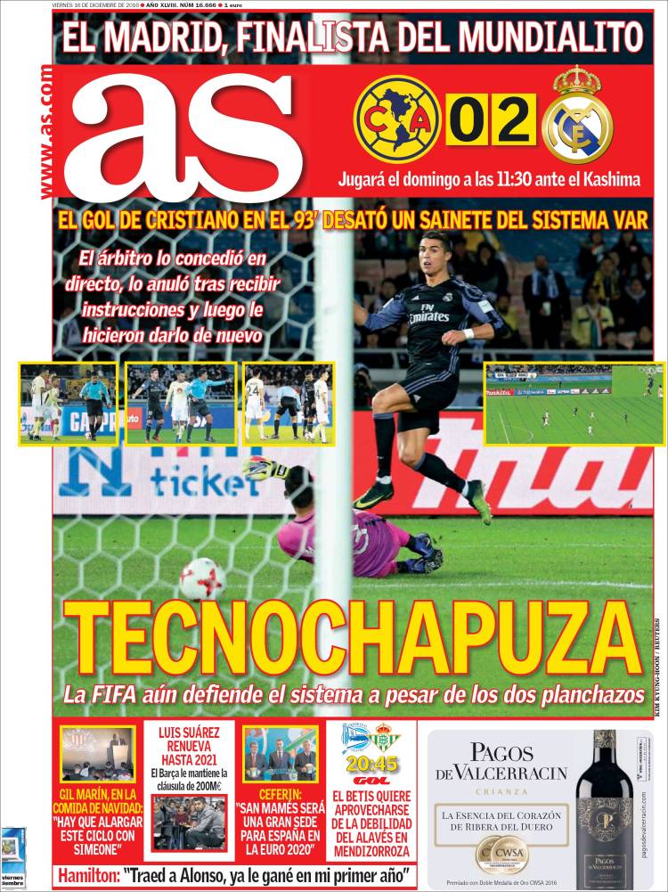 Mundo Deportivo regala a sus lectores (o lo vende, que el euro es el euro) el calendario del Barça 2017, y junto a él una lupa para encontrar un rastro de la victoria del Madrid, con el siguiente minúsculo titular, tercer recuadrito amarillo inferior empezando por la izquierda, junto al zapato Panama Jack: "Sigue el lío con el arbitraje por vídeo". Y encima de dicho titular, en un azul pálido prácticamente ilegible sobre el fondo amarillo, el marcador final del encuentro: "América-R.Madrid: 0-2". Bravo por la valentía del diario de Godó, Grande de España, que admite la existencia de la noticia.