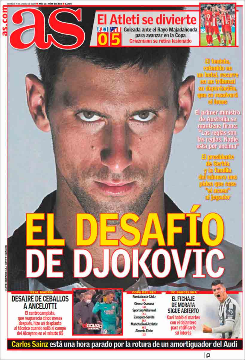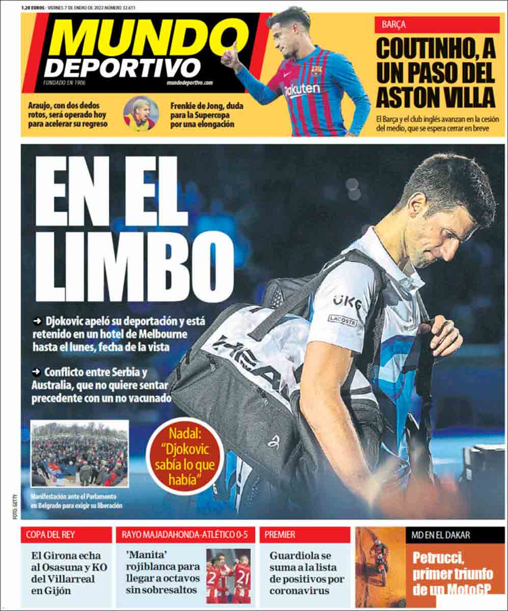 Buenos días. Las portadas de la jornada vienen prácticamente copadas por el asunto de la deportación de Djokovic en Australia. El tenista serbio ha recurrido dicha deportación y se encuentra en un hotel de Melbourne, fuera del cual el mundo se divide entre los que están con él y los que defienden la actitud de las autoridades australianas. El debate de fondo es por supuesto el de las vacunas, y no siendo La Galerna un medio dedicado al tenis, como tampoco uno dedicado a la realidad geopolítica mundial a la luz del Covid, lo más sensato que podemos hacer es mostraros las portadas alusivas sin más comentario que el que cada uno de vosotros quiera verbalizar en este primer desayuno postnavideño.
