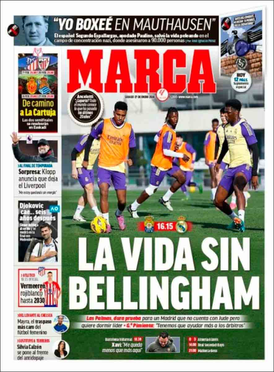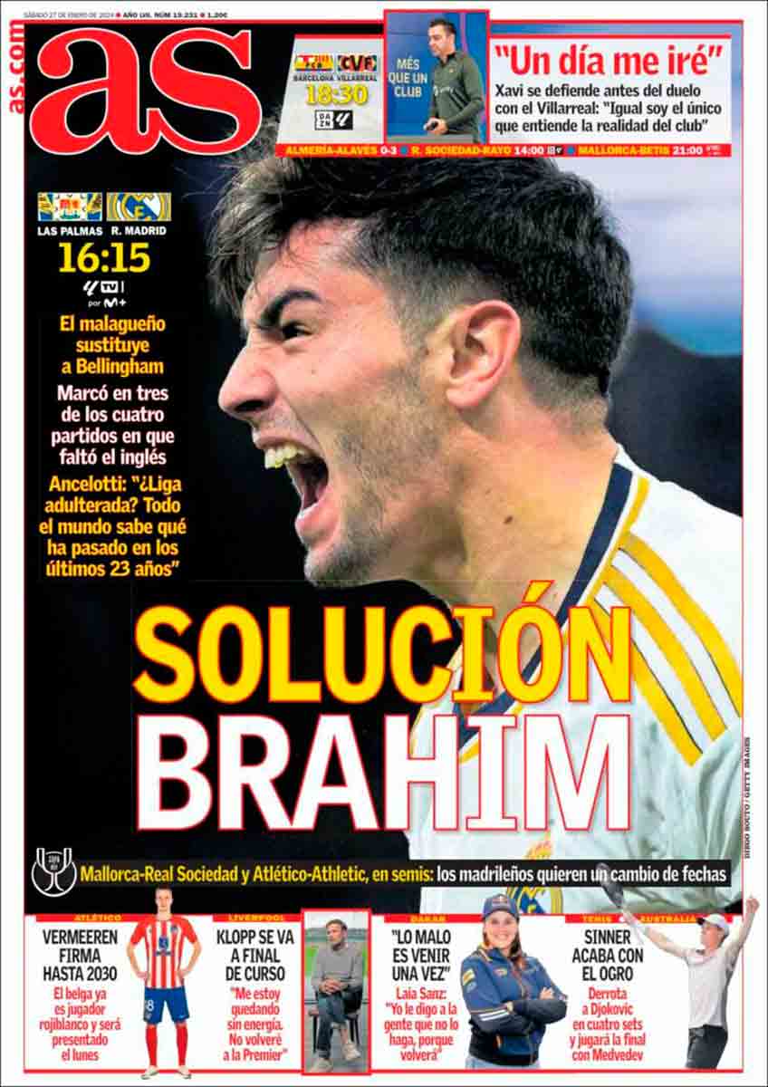 Elegante, como siempre. Discreto, as usual, pero soltando un par de “yoyas bien soltás”. Y aun con los guantazos verbales, no estamos de acuerdo en todo lo que dice Carletto. La portada de As es para Brahim, al cual tildan de “solución”, y el malagueño puede ser hoy la solución, la alternativa, porque el mejor jugador de la temporada, el máximo goleador y un referente espiritual y moral del equipo, Jude Bellingham, no estará en el estadio de Las Palmas por sanción. El jugador que más faltas ha recibido en el campeonato no podrá jugar hoy… ¡por acumulación de tarjetas!. Varias de ellas por quejarse amargamente a los árbitros, por decirles que “ya está bien, que miren cómo tengo las fucking medias de fucking pisotones impunes”. Luka Modric tuvo más partidos de sanción que Luis Suárez, luego se nos hace muy cuesta arriba afirmar como el bueno de Carlo que esta Liga no está adulterada, que no ha sido secuestrada por quienes han tenido bajo su control al CTA, el VAR, la Federación, el presidente del CSD o las retransmisiones.
