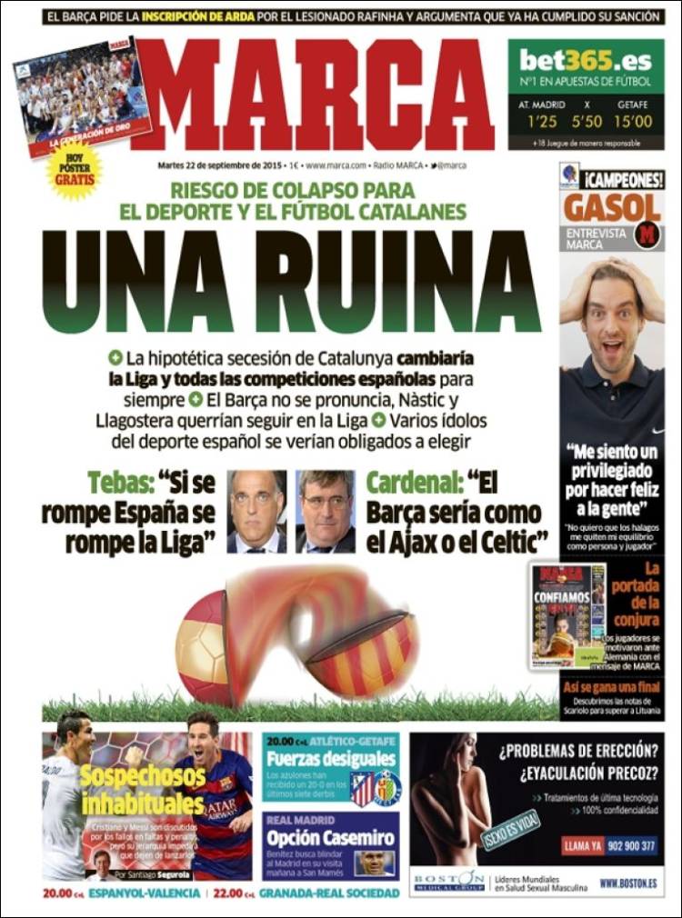 Buenos días. Hoy la prensa deportiva madrileña, al alimón con las instituciones, se rasga las vestiduras, pone el grito en el cielo y dedica sus portadas a anunciar el llanto y crujir de dientes que seguirían a una eventual independencia de Cataluña, centrando el sombrío panorama que describen (como no podía ser de otro modo, dada su especialidad) en las consecuencias que dicha coyuntura acarrearía en el plano deportivo.