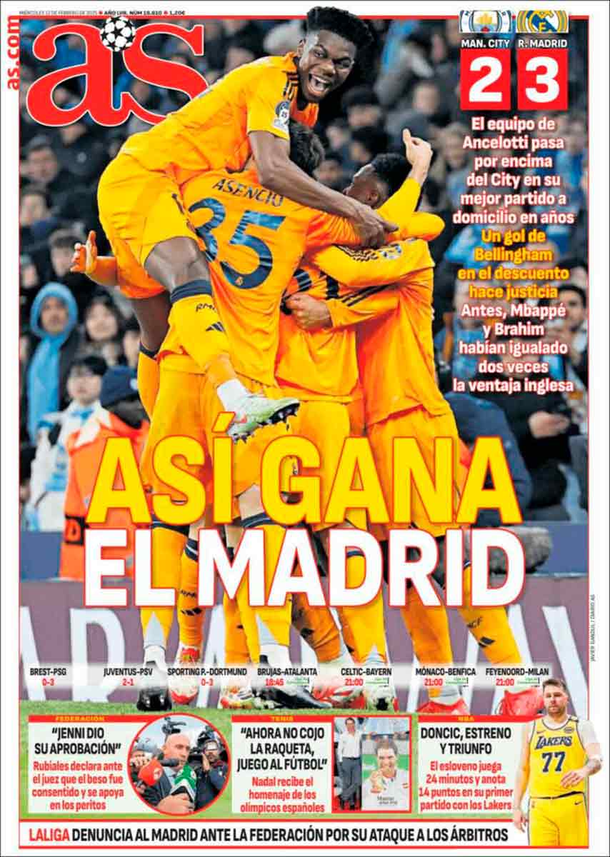 Como dice As, antes de ese gol postrero de Bellingham (¿cuántos goles decisivos ha marcado ya?) el Madrid había igualado sendas desventajas a pies de Mbappé y Brahim, pero es que esas desventajas nunca fueron justas, ni futbolística ni arbitralmente. Las imágenes sobre la posición de Gvardiol y Haaland no fueron concluyentes en el primer gol, como también resulta mosqueante la jugada del pretendido penalti de Ceballos. Esperemos que no haya un nuevo brote de UNICEF causando estragos en los pasillos de la UEFA. Hasta el momento, Ceferin nos había odiado en la distancia, digamos, sin traducir ese odio en arbitrajes sibilinos. Esperemos que este mínimo de decencia se mantenga.