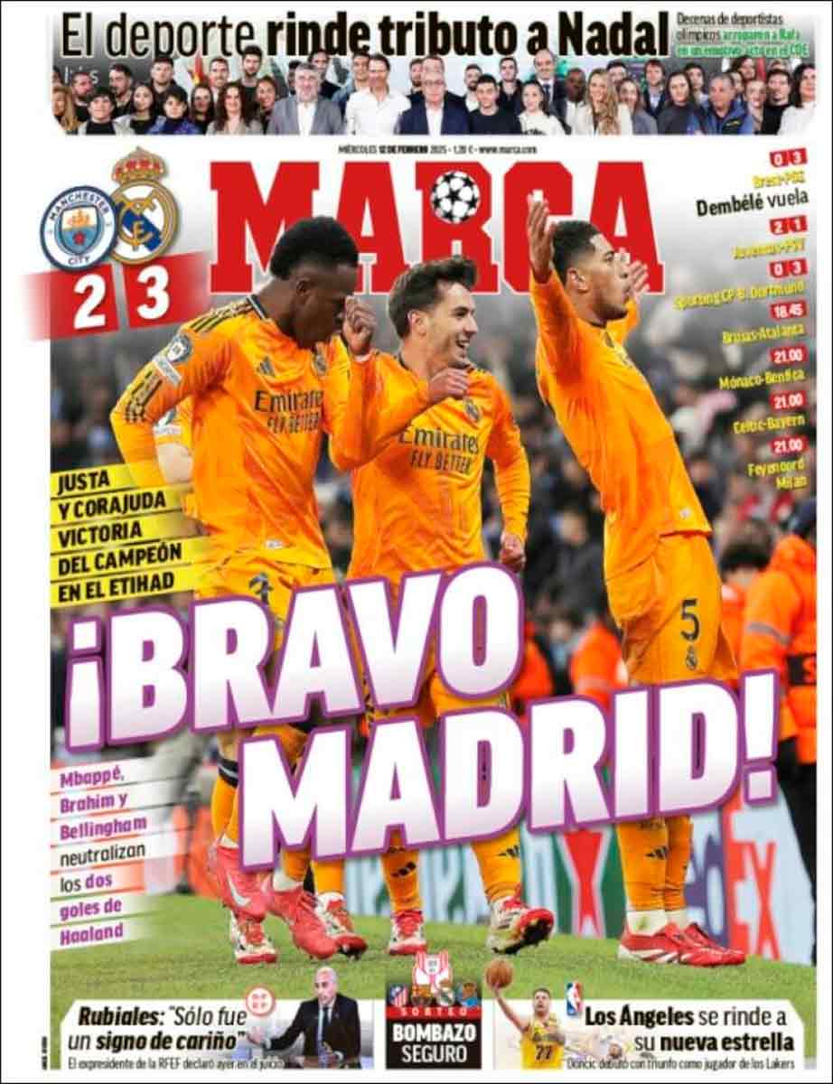 Marca describe al Madrid llamándolo “bravo”, queremos pensar, pues de lo contrario le faltaría la coma del vocativo a su portada. Pues sí, fue un Madrid bravo, estupendamente contado anoche, en La Galerna, por Andrés Torres y Genaro Desailly. Un Madrid que nunca se desesperó ante su propia mala puntería, y que a base de no tomar nota de sus errores al final metió tres: uno con la espinilla, otro en un rebote y un tercero a resultas de una vaselina mal ejecutada. El fútbol no hay quien lo entienda.