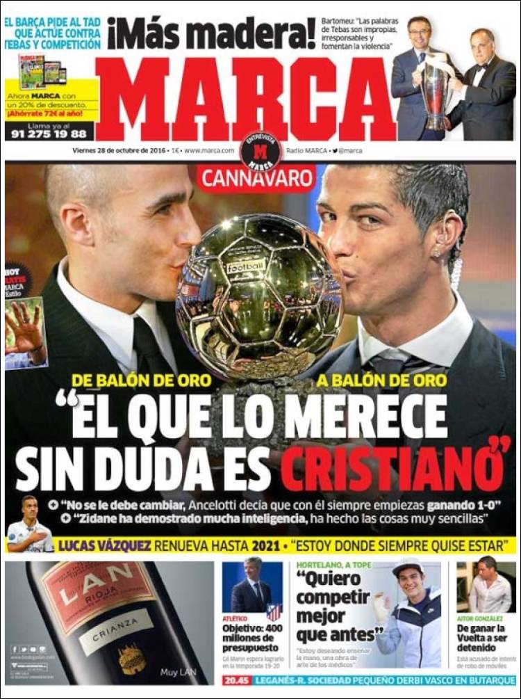 Por último, un pequeño apunte sobre la prensa madrileña. ‘Marca’ y ‘AS’ amanecen hoy con entrevistas a Cannavaro y Marcos Llorente, respectivamente. Lo curioso es que el primero dedica un pequeño espacio a la renovación de Lucas Vázquez hasta 2021 y en Ouija Today no