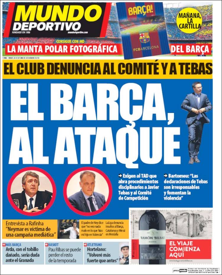 En ‘Mundo Deportivo’ omiten la palabra “guerra”, pero dejan claro que el Barcelona pasa al ataque. En esta partida de ajedrez que juega el club blaugrana contra rivales que no existen, parece que es el turno de Bartomeu. “Las declaraciones de Tebas fomentan la violencia”, disparó el presidente del cuartofinalista de la Champions League. Ya tiene Luis Suárez a quién echarle la culpa el día que vuelva a agredir a un rival. Rafinha, por su parte, en entrevista concedida a este medio, desliza que Neymar “es víctima de una campaña mediática”. Juraríamos que a Neymar es