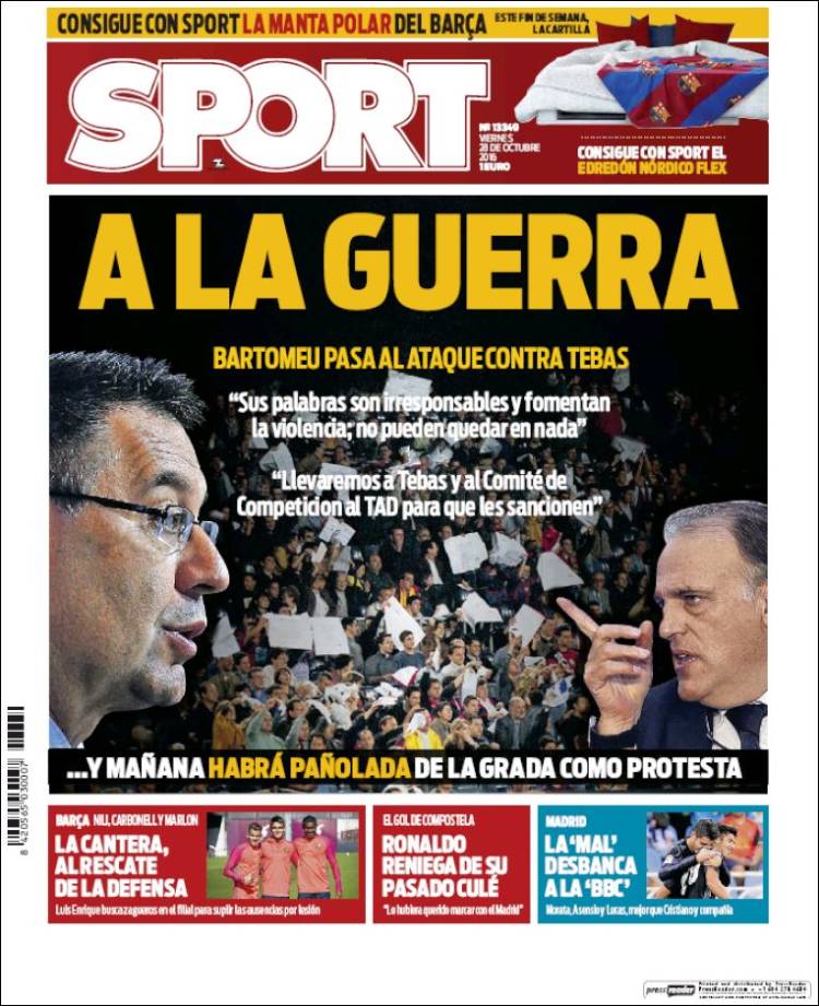 El diario ‘Sport’ es contundente en su portada de este viernes: “A la guerra”. Cuenta que Bartomeu pasa al ataque contra Javier Tebas y que habrá pañolada en el Camp Nou. Desde La Galerna queremos agradecer al Barcelona el detalle de rendir homenaje al campeón de Europa con miles