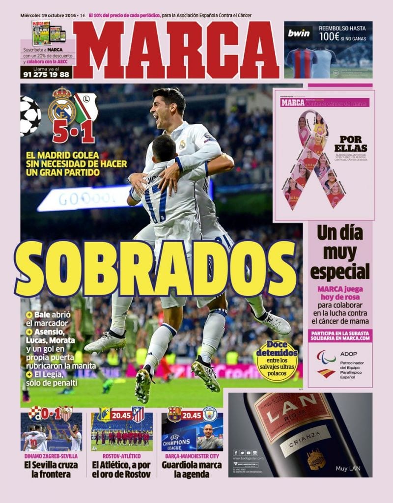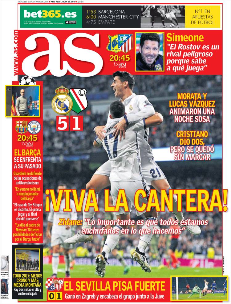 Tú nos debes la siguiente explicación, Alfredo: ¿cómo puedes ser tan sumamente pesado con lo de la cantera? Llegaríamos a pensar que eres eso tan pintoresco de lo que sin duda algún día tendremos noticias: un nacionalista madrileño, concepto que en cualquier otra persona supondría la más cínica y alambicada forma de repudiar cualquier nacionalismo pero que en tu caso parecería cobrar un extraño sentido si no fuera porque a tu portada de hoy traes a Morata pero también a Lucas Vázquez, que es canterano pero gallego. Nacido, por tanto, fuera de la comunidad de Madrid. Eso es lo que nosotros llamamos amplitud de miras, cosmopolitismo.