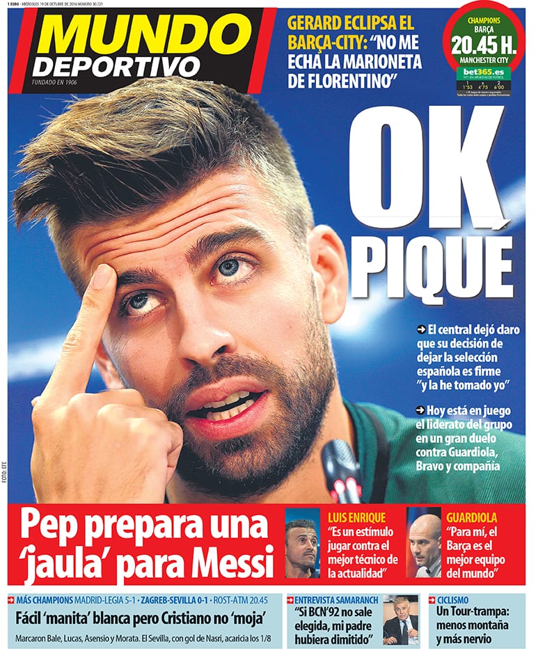 Por lo demás, Marca luce hoy rosa en solidaridad con la lucha contra el cáncer de mama. Nos unimos a esta buena causa, declaración tras la que resulta imposible hablar de Piqué. Que sepáis, eso sí, que el presidente en ciernes del Barça sigue dando titulares en la Ciudad Condal. Otro pesado, y de los gordos.