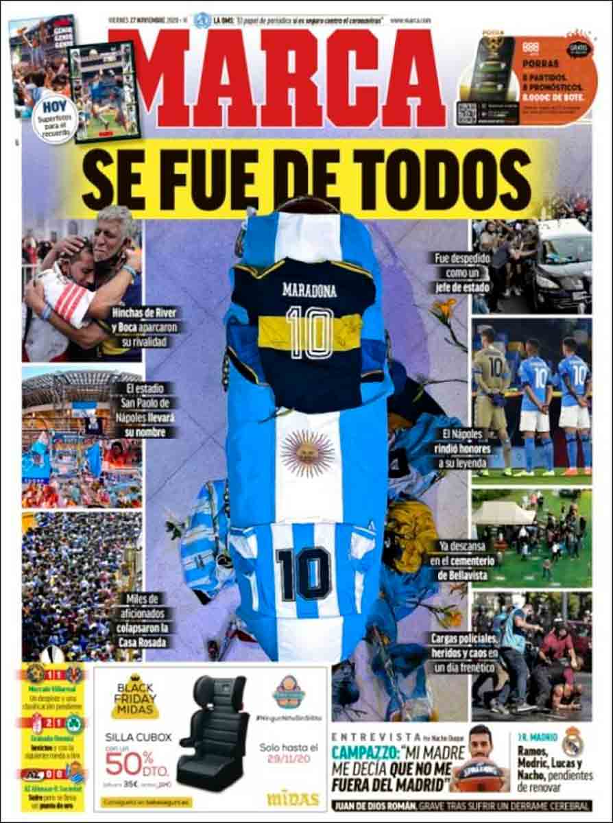 Sí. Se fue de todos. Es una frase que refleja con fortuna el alcance planetario de la pérdida. Sabemos por la portada de Marca del acontecimiento luctuoso que la muerte de Diego ha supuesto en su país, así como en Nápoles (el estadio del club local pasará a tener el nombre de la estrella). Es tan abrumador el peso de la noticia que apenas queda sitio para nada más en esta primera plana, aunque en clave madridista se nos hace saber de lo declarado por otro argentino, Campazzo, que seguramente estará también afectado por la partida de Diego. El Facu habla de su marcha del Madrid, de cómo su madre intentó convencerle para que no se fuese (Dios bendiga a esa señora), pero el indudable interés del testimonio no llega a calar en un panorama inundado por la presencia apabullante del Pelusa. Tampoco lo relativo a las posibles renovaciones de algunos componentes de la sección de fútbol, esta vez. Todo continúa siendo Diego.