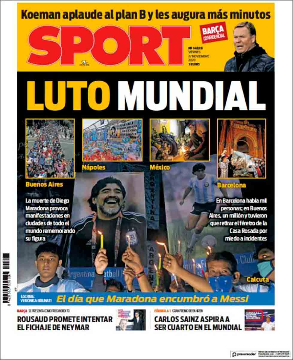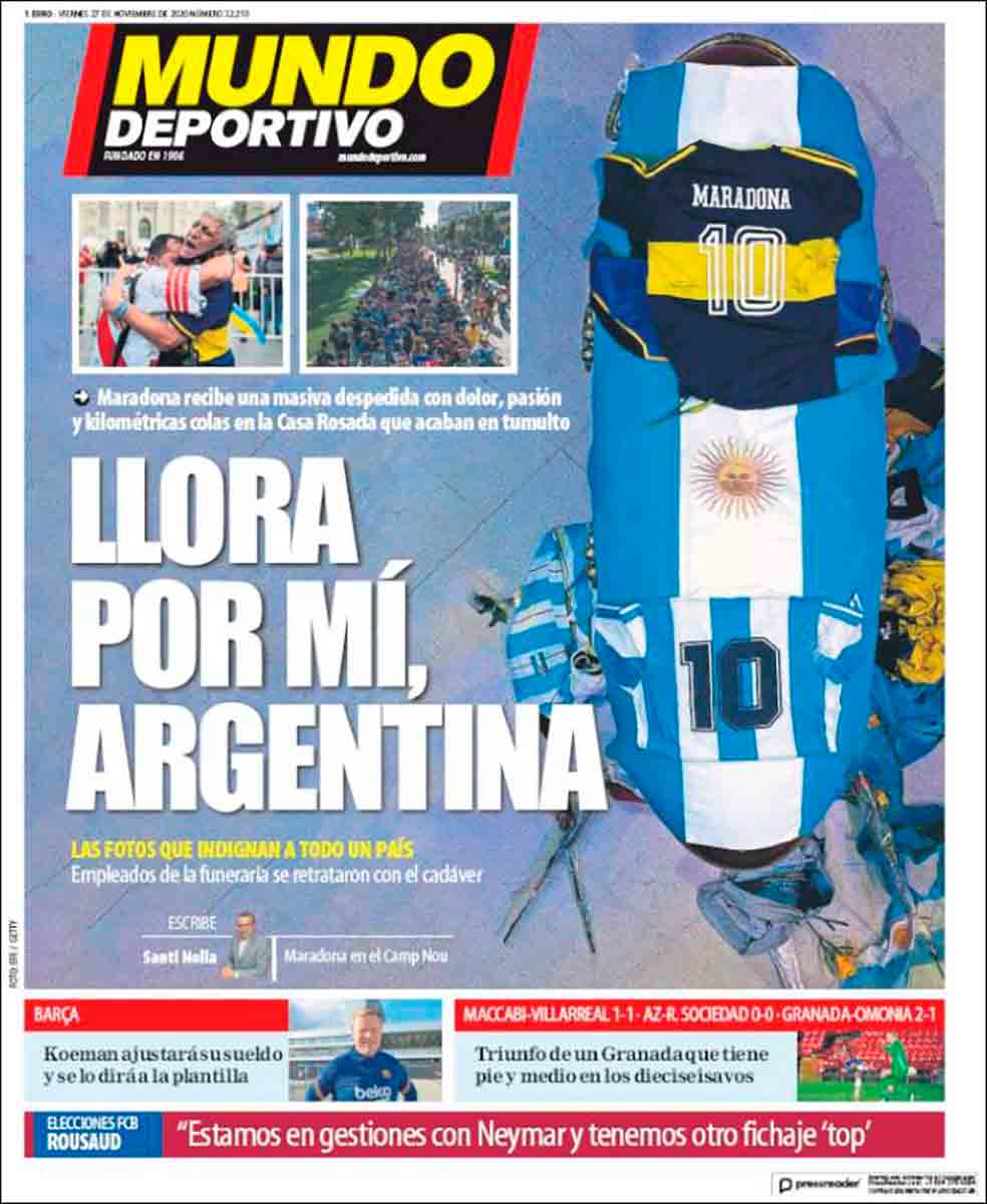 Decíamos que es en Argentina, obviamente, donde la tragedia nacional marca un antes y un después. Un país consternado ha despedido al ídolo, y no ha sabido hacerlo sin que se hayan desatado incidentes de orden público. Todo ha sido exceso, acaso en consonancia con la personalidad del finado. “Dolor y caos”. En efecto. Hinchas asaltando la sede del gobierno por no poder velar el cadáver. Hecatombe colectiva. Detenciones. Incluso, en un giro grotesco y macabro, unos empleados de las pompas fúnebres que lidiaron con las exequias hicieron circular por redes sociales unas fotos posando con el cuerpo sin vida del icono. Parafraseando la famosa pregunta, en un sentido completamente distinto, ¿de qué planeta vinieron esos anormales? Mucho nos tememos que se cierne sobre ellos la amenaza de una turba de hinchas que se sienten ultrajados por esta chocante ceremonia lúgubre. Dios proteja de esas iras a esos imbéciles. No querríamos estar en su pellejo. (En realidad nunca podríamos haber estado en él, afortunadamente). Mundo Deportivo da cuenta en su portada del morboso evento, además de subrayar la condición de tragedia nacional que este adiós representa para todo un país. “Llora por mí, Argentina”. Está bien citar el musical sobre otro de los grandes mitos de esa nación para despedir al mito que se acaba de ir. Como decimos, son todos mitos nuevos, relucientes: Evita, Gardel. Y ahora Maradona.