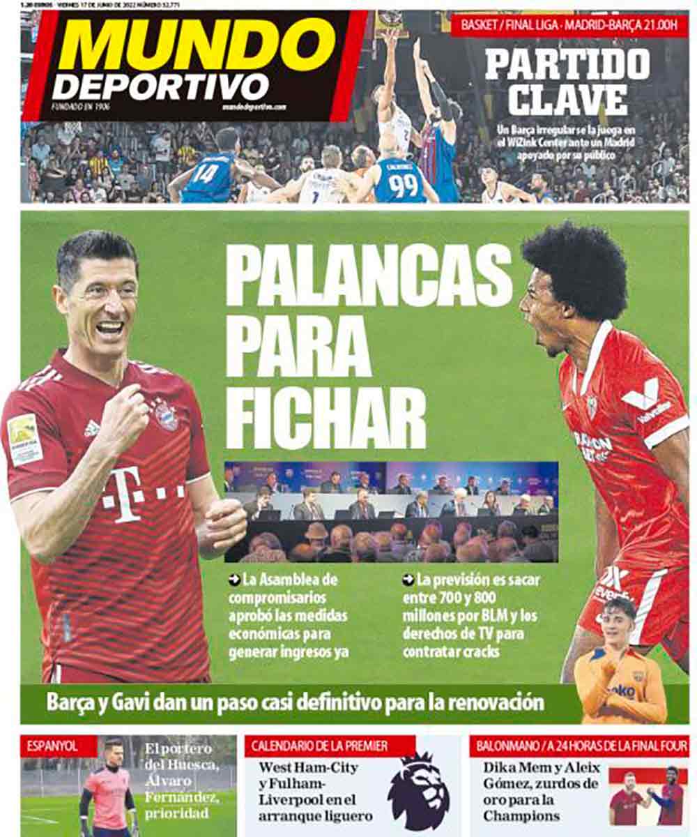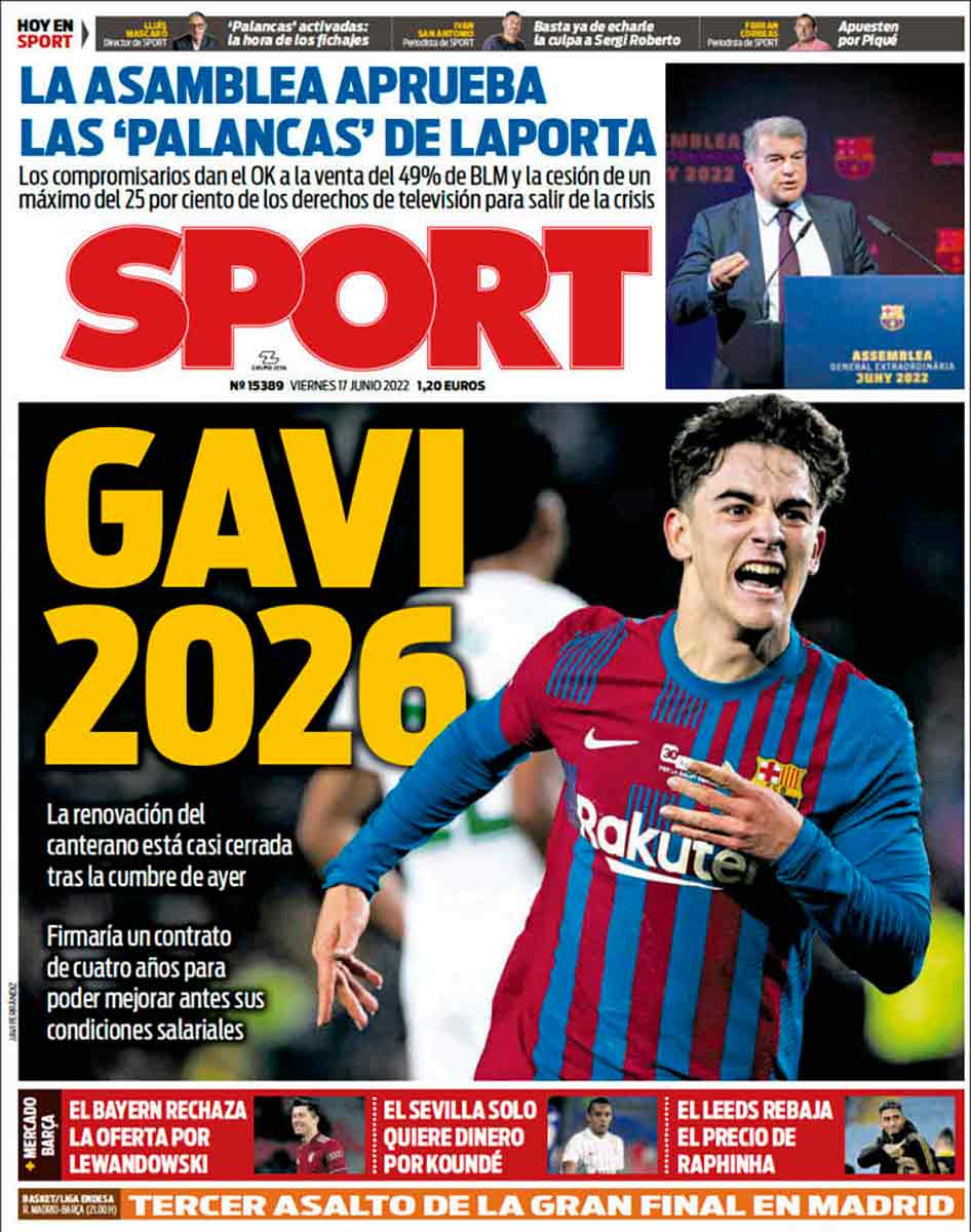 Mundo Deportivo también lleva en su frontispicio el asunto de las palancas. Y también habla de Gavi. Han tenido el buen gusto de elegir una fotografía del joven realizando lo que parece un corte de mangas. ¿Efecto óptico? ¿Es la respuesta a la oferta de renovación del Barça? ¿Es una palanca levantada como la de Piqué?