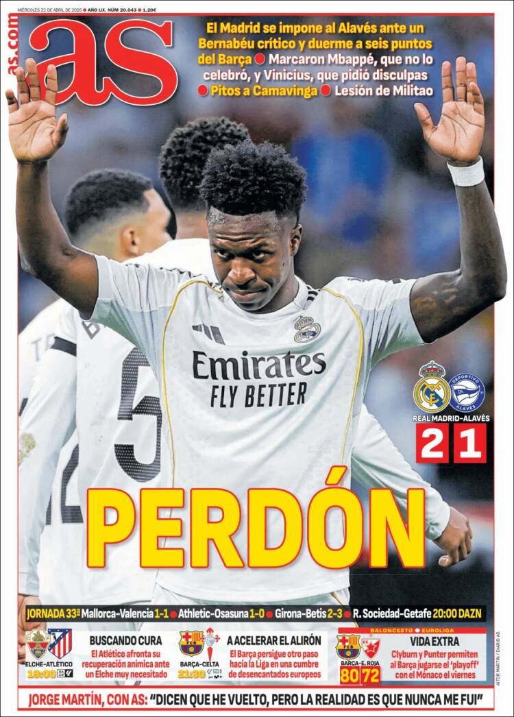 As se decanta por titular “Perdón” sobre el gesto de Vini tras anotar su gran gol. Mientras los danzantes dazoneros balbuceaban que el siete había madurado, en La Galerna nos inclinamos más por que el brasileño pidió perdón por la temporada que nos ha «regalado» el equipo. Una campaña calamitosa con ráfagas, pocas, espléndidas que demuestran que podrían haber dado más en caso de habérselo propuesto.