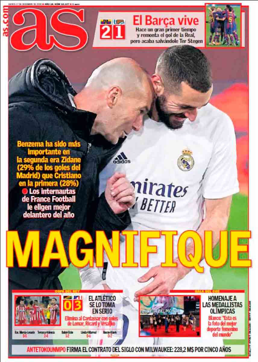 Vaya. Junto a una espléndida foto de Benzema y Zidane topamos con una merecidísima alabanza al jugador francés, con algunos datos importantes, y en la esquina superior derecha se da cuenta brevemente de lo sucedido en el Camp Nou, pero estrictamente en el campo deportivo, no en el cuasicriminal. Tampoco debe escandalizarnos este silencio, ahora que lo pensamos, cuando salvo error u omisión ni As ni Marca dijeron en su momento ni pío sobre otra acción similar, pero más grave aún, acontecida en alguno de los componentes de la Tormenta de Clásicos de la era Mourinho-Pep. Nos referimos a aquel balonazo que Leo Messi propinó a un señor mayor de la grada del Bernabéu para luego darse la vuelta riendo. Si aquello tan incalificable no se resaltó, poco cabía esperar que a esto otro se le diera el bombo que por su iniquidad merece.