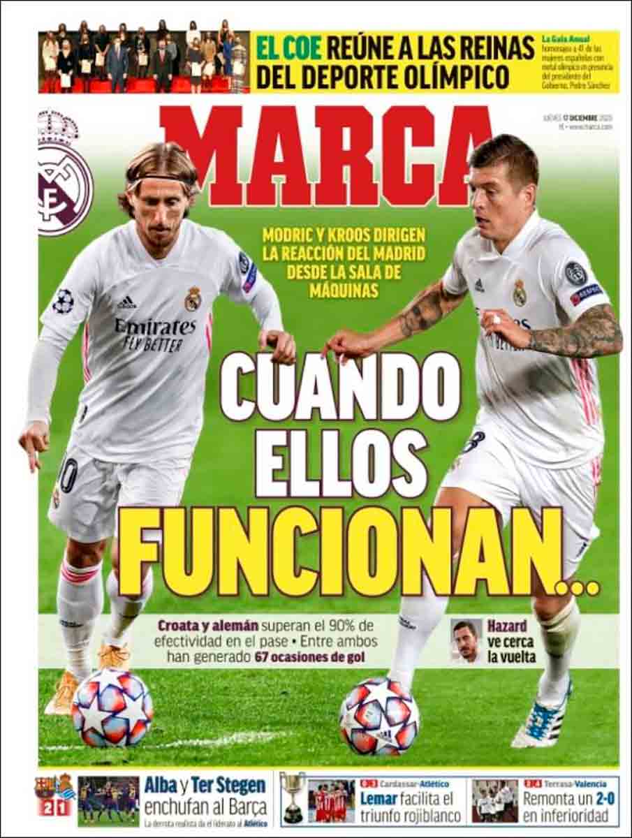 Nosotros solo vemos una loa bastante obvia a la importancia de Kroos y Modric en el juego del Real Madrid y abajo, en pequeñito, una mención a Alba (junto a Ter Stegen) pero no como reproche a su incalificable acción, sino como ponderación del gran partido que pese a todo —es verdad— disputó frente a la Real. Sucede que (cuando no está ocupado en lesionarse de tanto fingir haber sido lesionado, fingir bochornosamente penaltis dando patadas al suelo, llorando patéticamente ante los colegiados o, como ahora, reventando a balonazos alevosos las cabezas de sus compañeros de profesión) Jordi Alba es un gran futbolista, como lo prueba su enorme gol y su asistencia de ayer. Solo a eso, y no a lo otro, se refiere la portada de Marca.